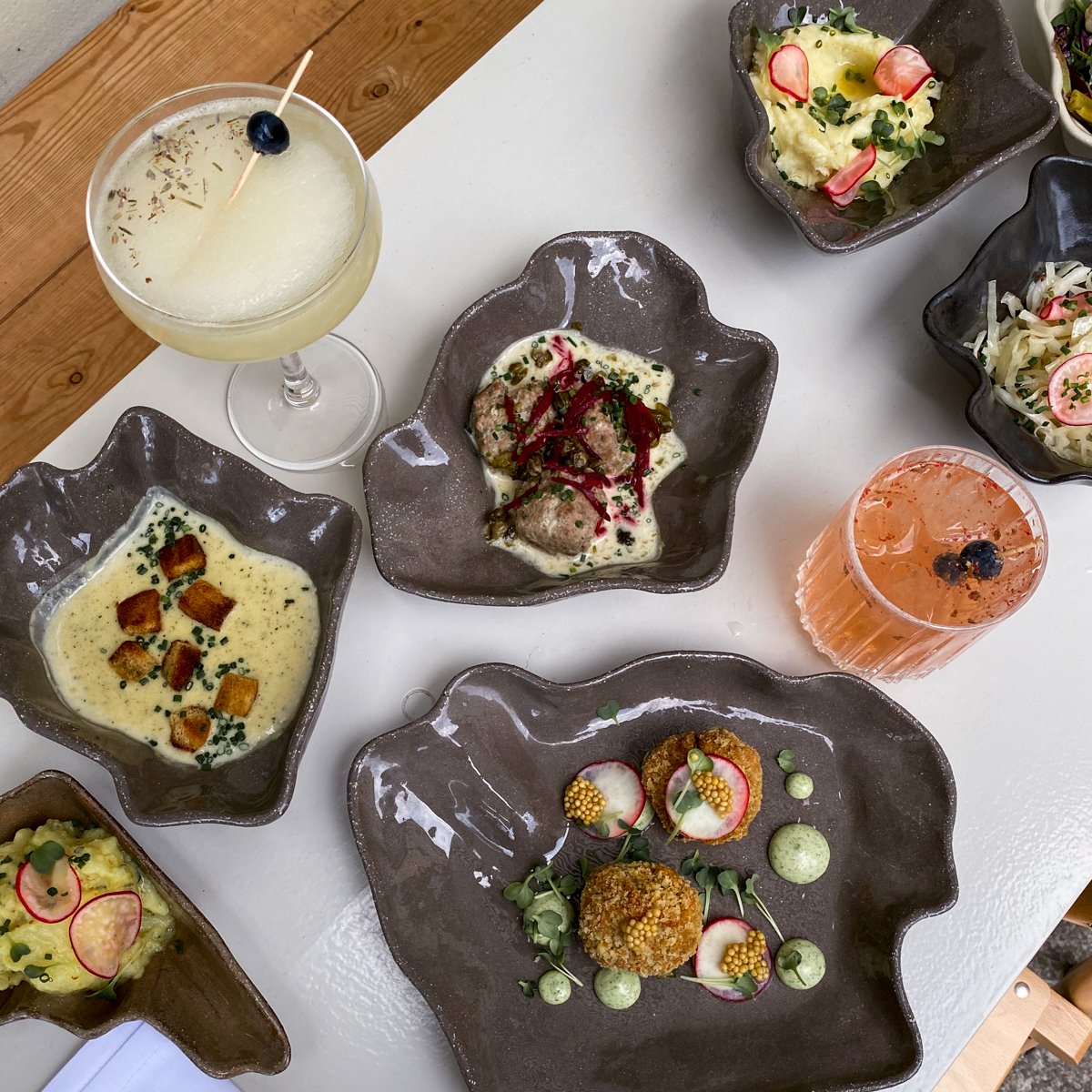 When the food arrives at the table, the first glance inevitably falls on the specially shaped plates, which are a copy of the Victoria Hills in Kreuzberg, another allusion to the origins of the three Klinkenberg siblings. The tableware provides the perfect stage for the colourful round of dishes presented to us.