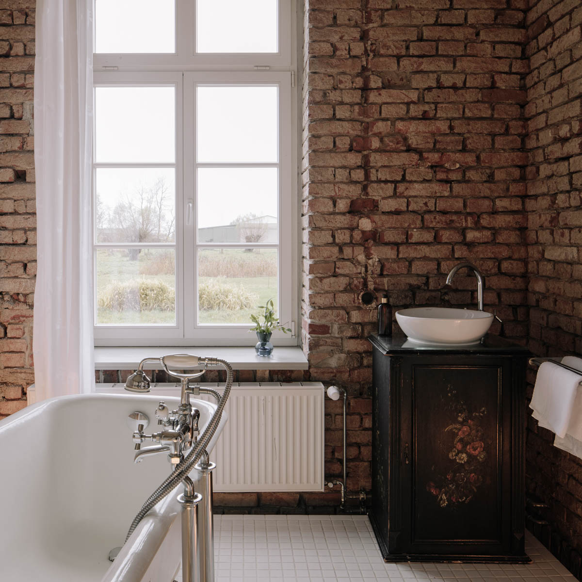 In addition to six individually designed hotel rooms on the ground floor of the manor house with antiques, cast-iron stoves and free-standing bathtubs, two spacious studio flats with their own kitchen have recently been added on the top floor. One of these will be our comfortable home during our stay of several days.