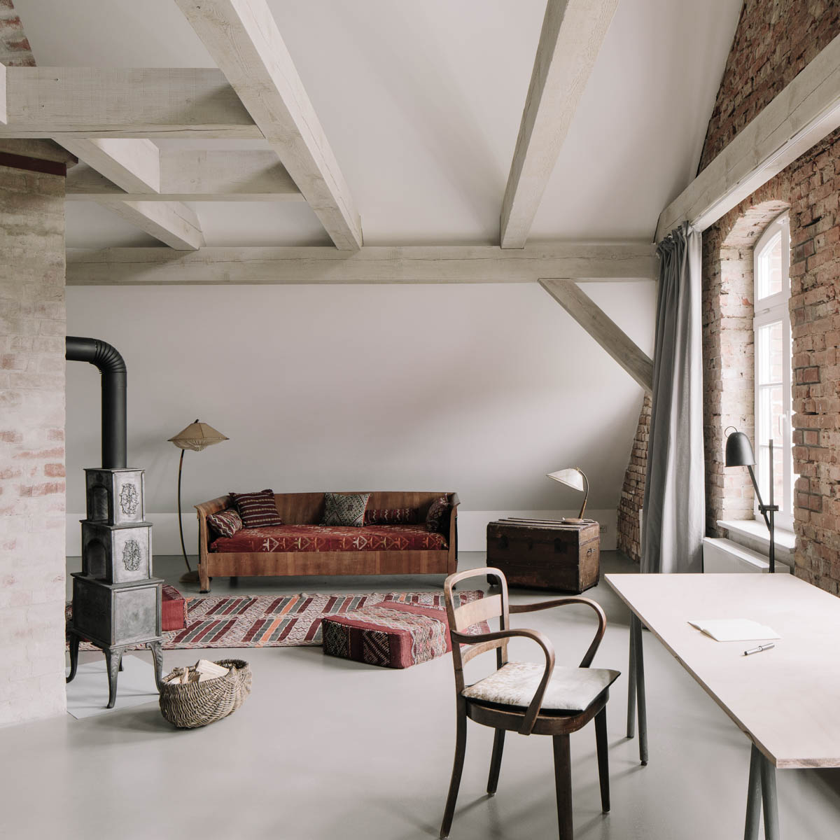 The rooms were designed by New York artist and architect Alex Schweder, whose work has already been shown at the Museum of Modern Art, Tate Britain and the Architecture Biennale in Venice. He created an architectural gem from a dilapidated ruin, in which the unfinished and the processual are part of the refurbishment concept.