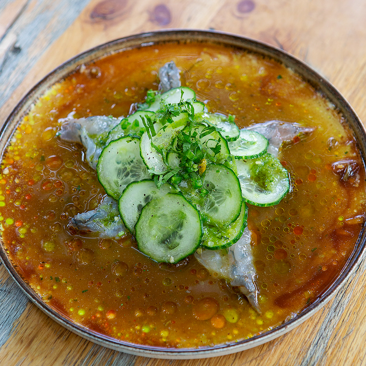 We also react enthusiastically to the following dishes: pulpo with fried leeks and shrimp ceviche with corn. The octopus has just the right, tender consistency that is rarely found in Germany, even in top restaurants. Like the shrimp ceviche, it is boldly flavoured. The fierce use of chilli and acid in the salsa marisco tickles the mouth and immediately makes you want to take the next bite. The mezcal served with the ceviche does the rest to transform the buzz of voices in the Pfefferberg market hall into the sound of the sea for a few seconds with each sip.