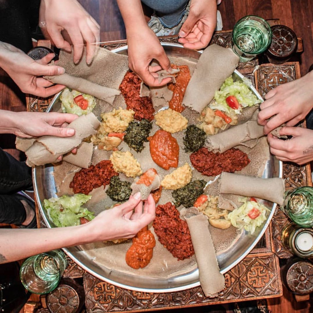 Ethiopian cuisine is known for its variety of flavours and spices. A typical meal consists of injera, a sour flatbread that serves as a base, and various side dishes such as doro wot (spicy chicken dish), sega key wot (beef) and vegetarian dishes such as misser wot (red lentils) or gomen (kale).
