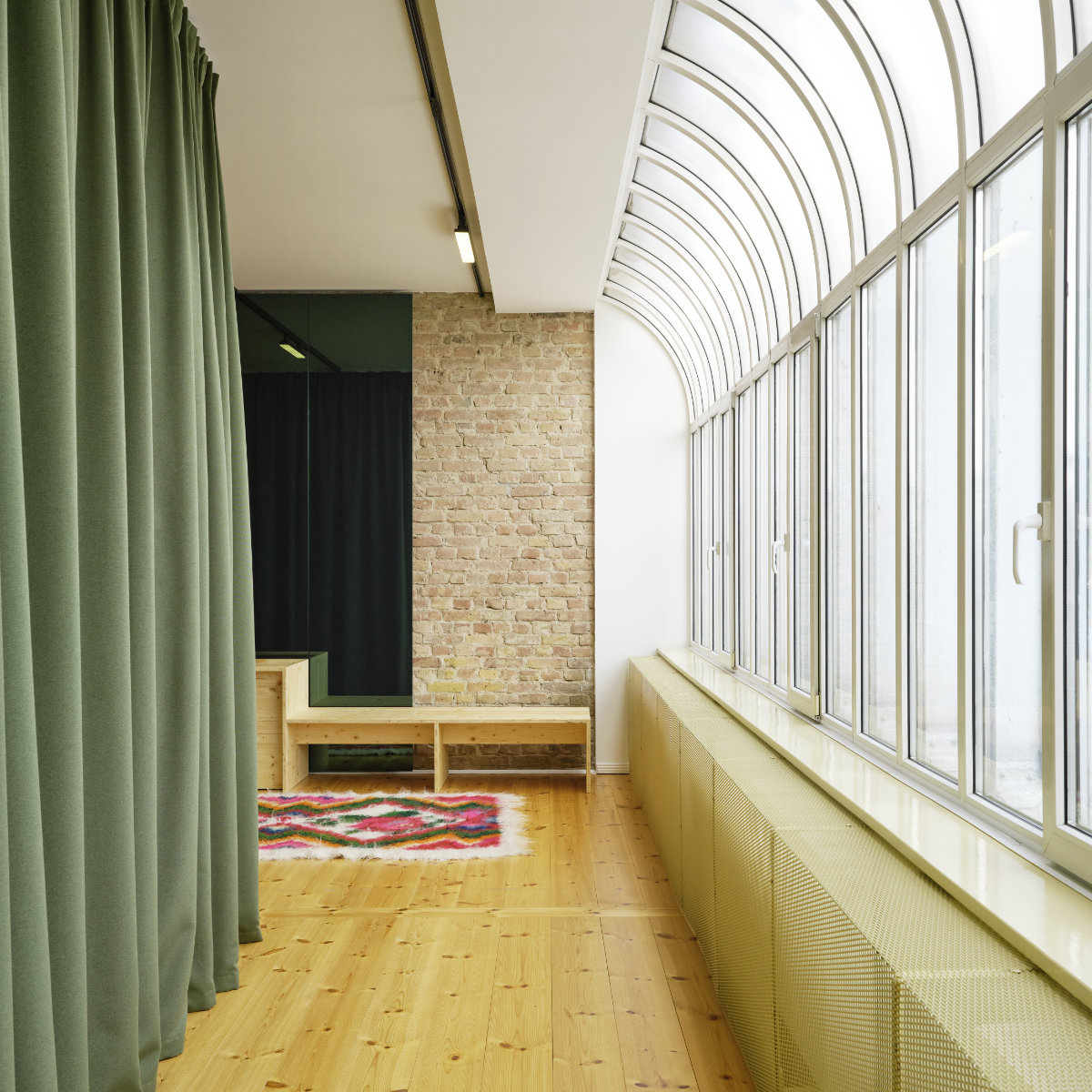 Light and dark green shelves and counters present themselves in austere shapes. Shiny metallic mirror walls mark the ends of the long window front, and heavy, sound-absorbing curtains in green, salmon pink or bright yellow delimit the treatment areas. Brightly coloured cushions and kilims or even neon-coloured chairs set skilfully arranged accents. And then there's the view. Simply ingenious!