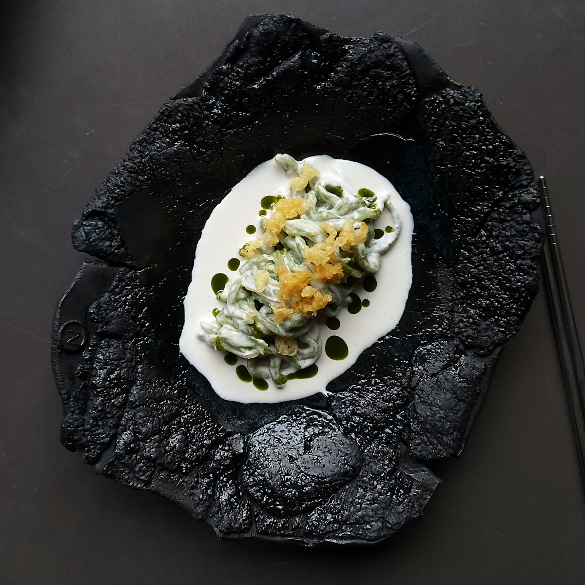 We also like this miso intensity exceptionally well in the DönDsang ice cream made from soybeans fermented for six months with caramelised soy sauce. In general: more miso in the ice cream! The remarkable umami depth suits the dessert quite well. Incidentally, Jinok Kim is already working on new ceramics for the upcoming menu upstairs at NaNum. After all, spring is now well underway, which means that the menu at NaNum will soon adapt to the plants in the garden again.