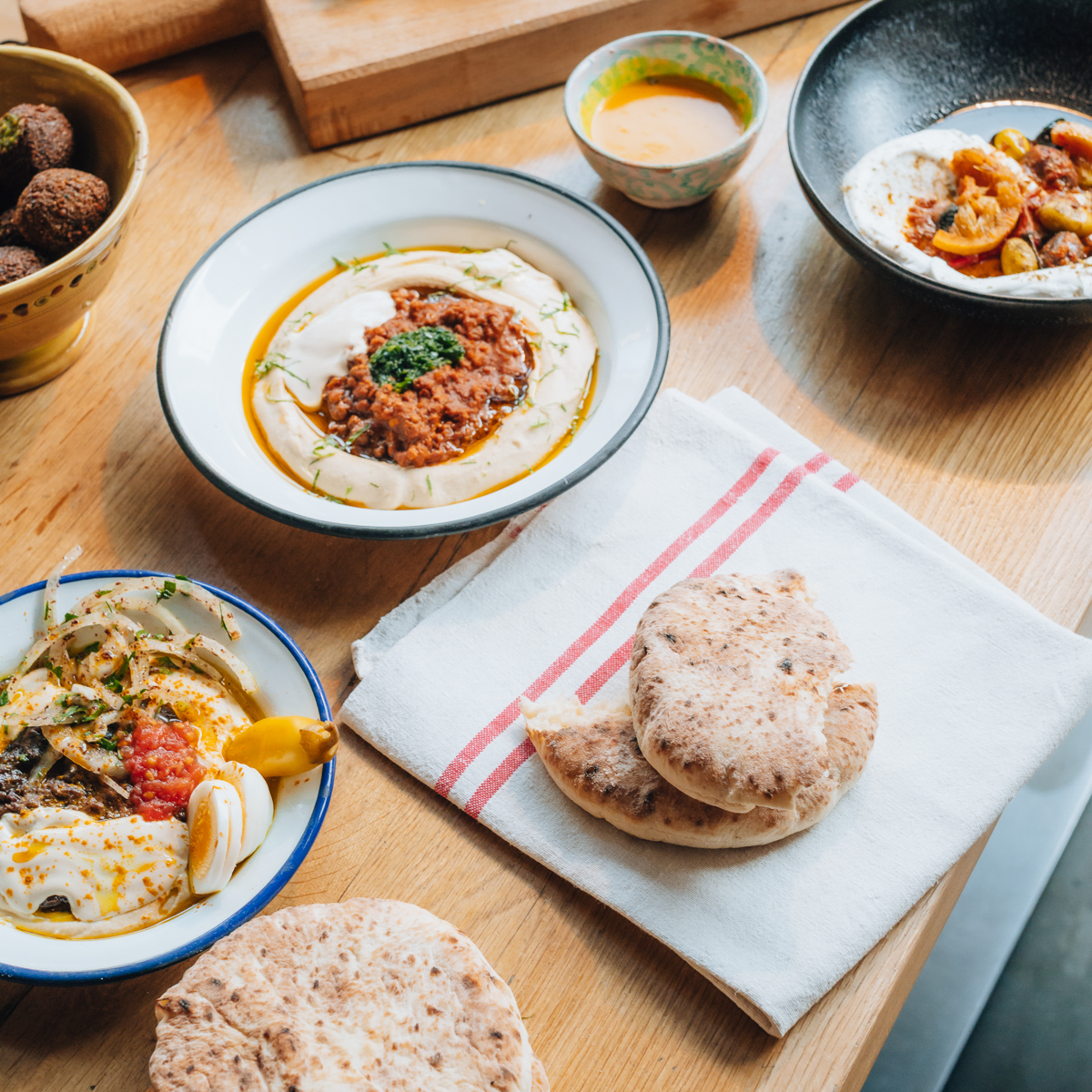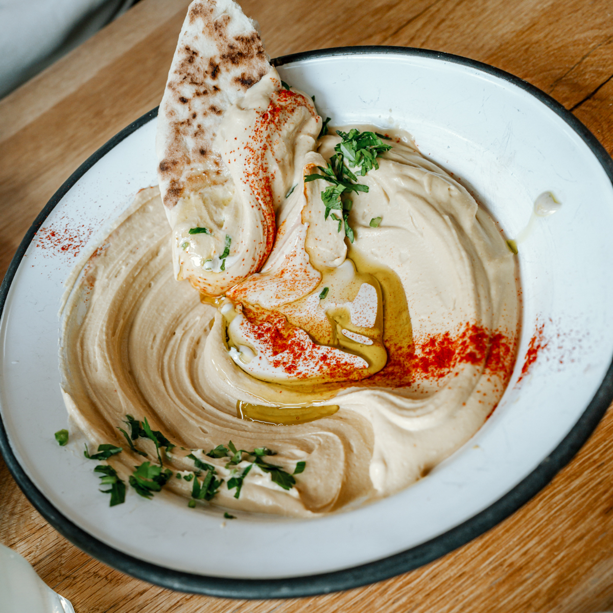“Nuriel’s Favourite Falafel” is, of course, a must. The classic chickpea balls are served with tahina and zhug – a Yemeni chilli sauce made from garlic, coriander, and spices. The “Babaganoush” is also wonderfully aromatic, made from smoky aubergine purée, chilli oil, sourdough crumbs and parsley – served with house-baked pita bread.