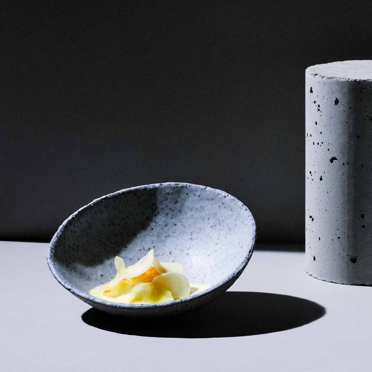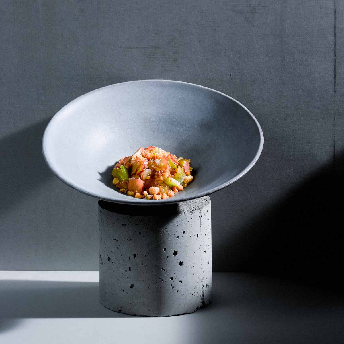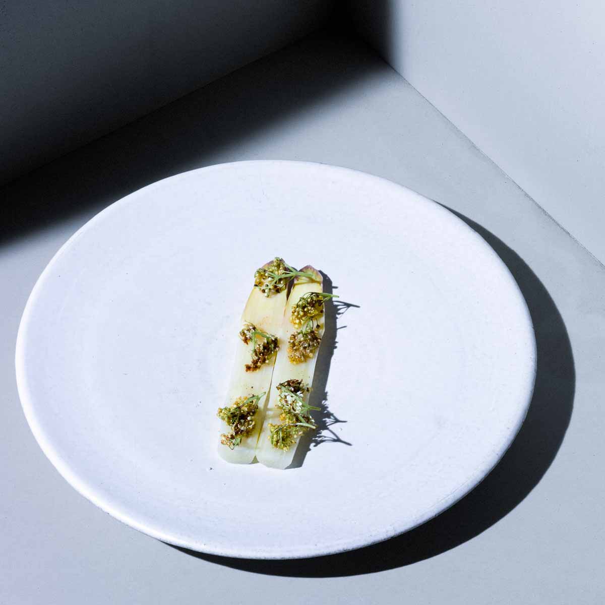 Guests sit around the long, u-shaped counter, as if they were theater-goers observing the chefs on stage. They are invited to follow how their next course is being put together. The hand-crafted plates from a Berlin-based Buddhist potter are often laid before the diner with only one or two ingredients on them.