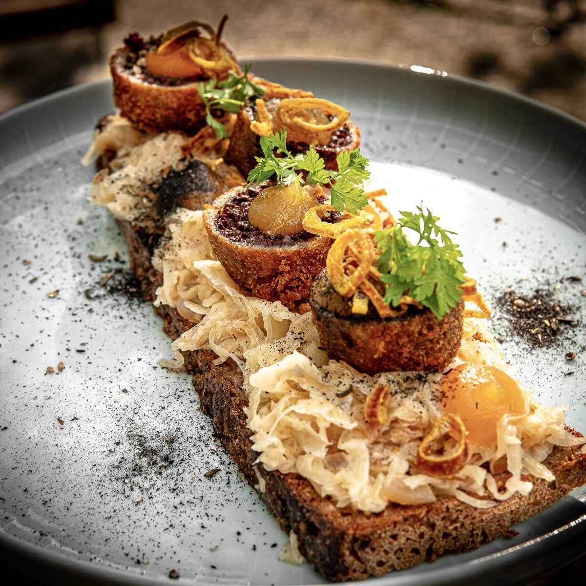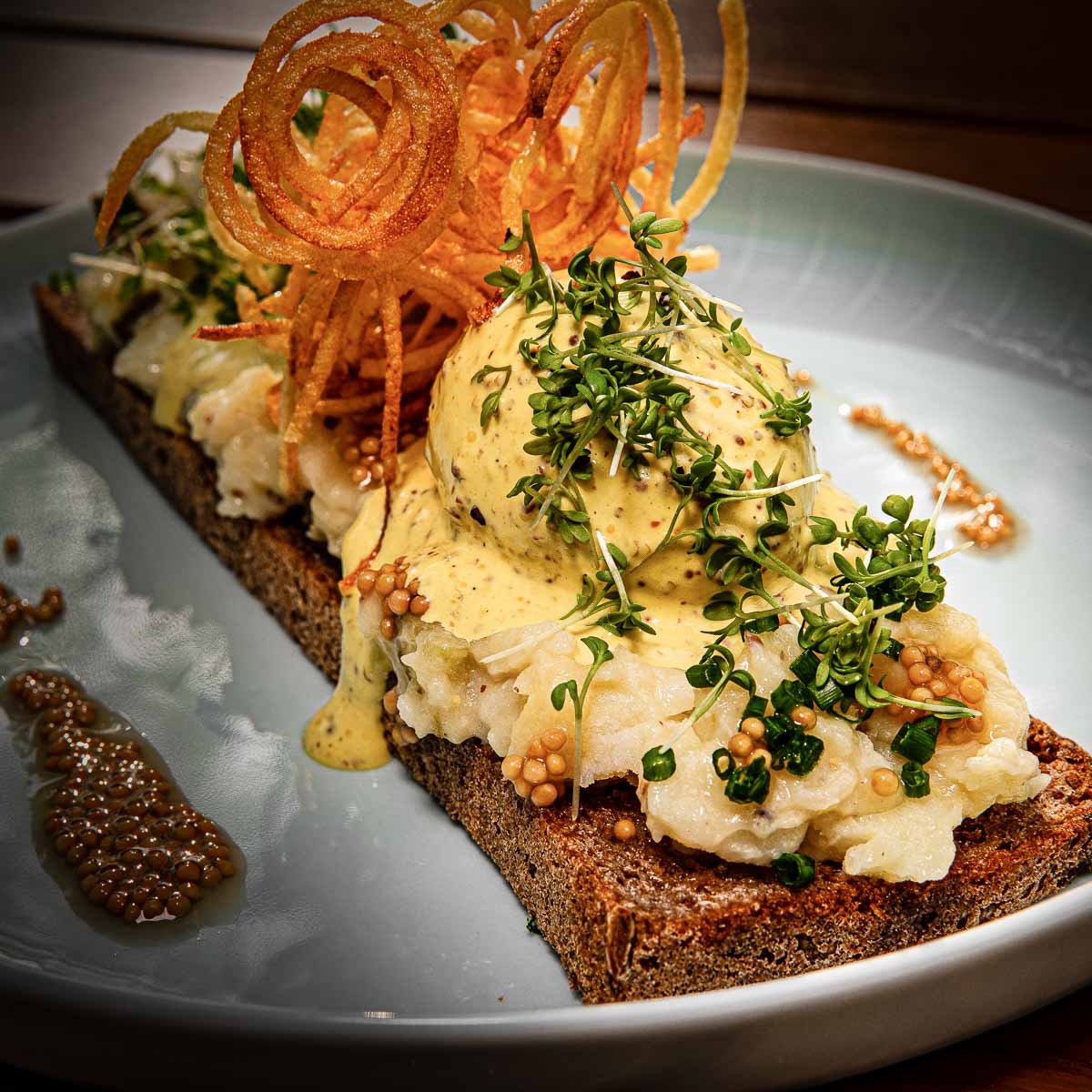 Regional cuisine is presented on sandwiches, as "Berlin bites" like tapas, as well as in refined modern mains. While the sandwiches arrive topped with hefty ingredients like black pudding, applesauce, sauerkraut, and roasted onions, the "Berlin bites" include dishes like an excellent vegan potato salad, black pudding croquettes, and homemade fish sticks.