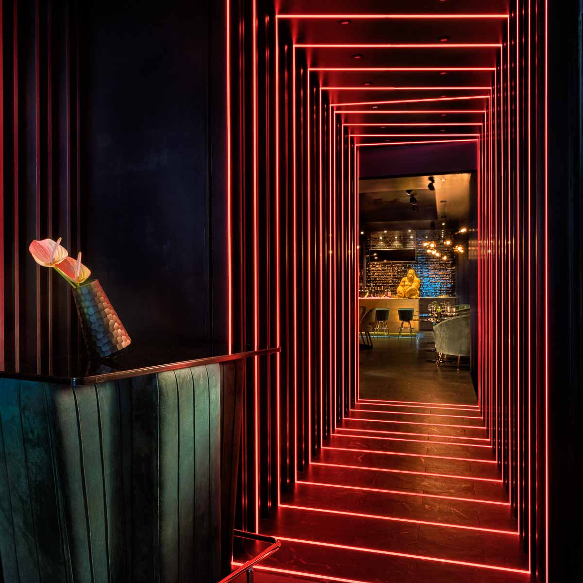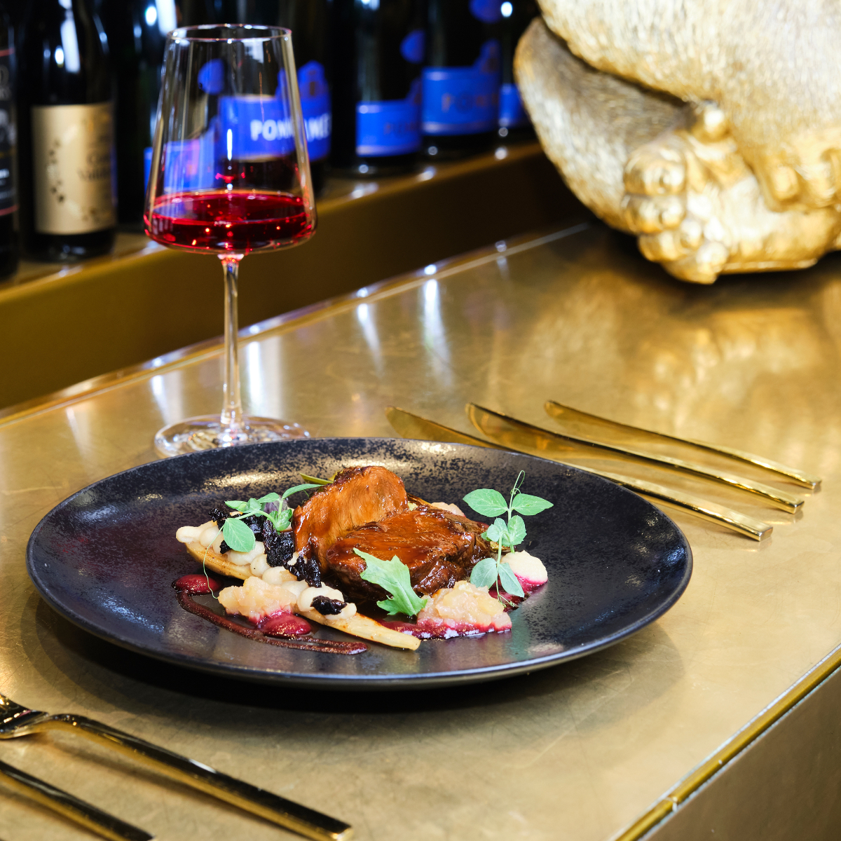 The ambience remains old-school striking, with its own unique flair. Black marble tables, dark walls, and dark blue velvet chairs are one thing. All these tones are accentuated by abundant gold elements, from the golden counter with a golden gorilla to the cutlery and the golden bread plates in the shape of a leaf.