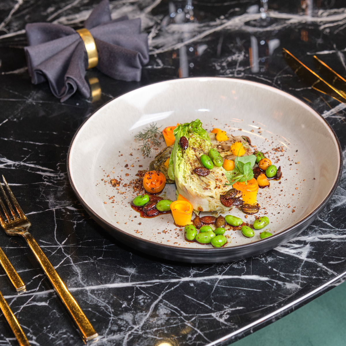 For the first course, we get a mini version of the Teriyaki Onglet, which is marinated in the house sauce for 24 hours, cooked sous vide and seared before serving. It's worth the effort! The love is in the detail. In the grilled lettuce, one of the vegan starters, the delicate seasoning has a special feature: the lettuce salt, for which the stalks are dried, ground and mixed with salt.