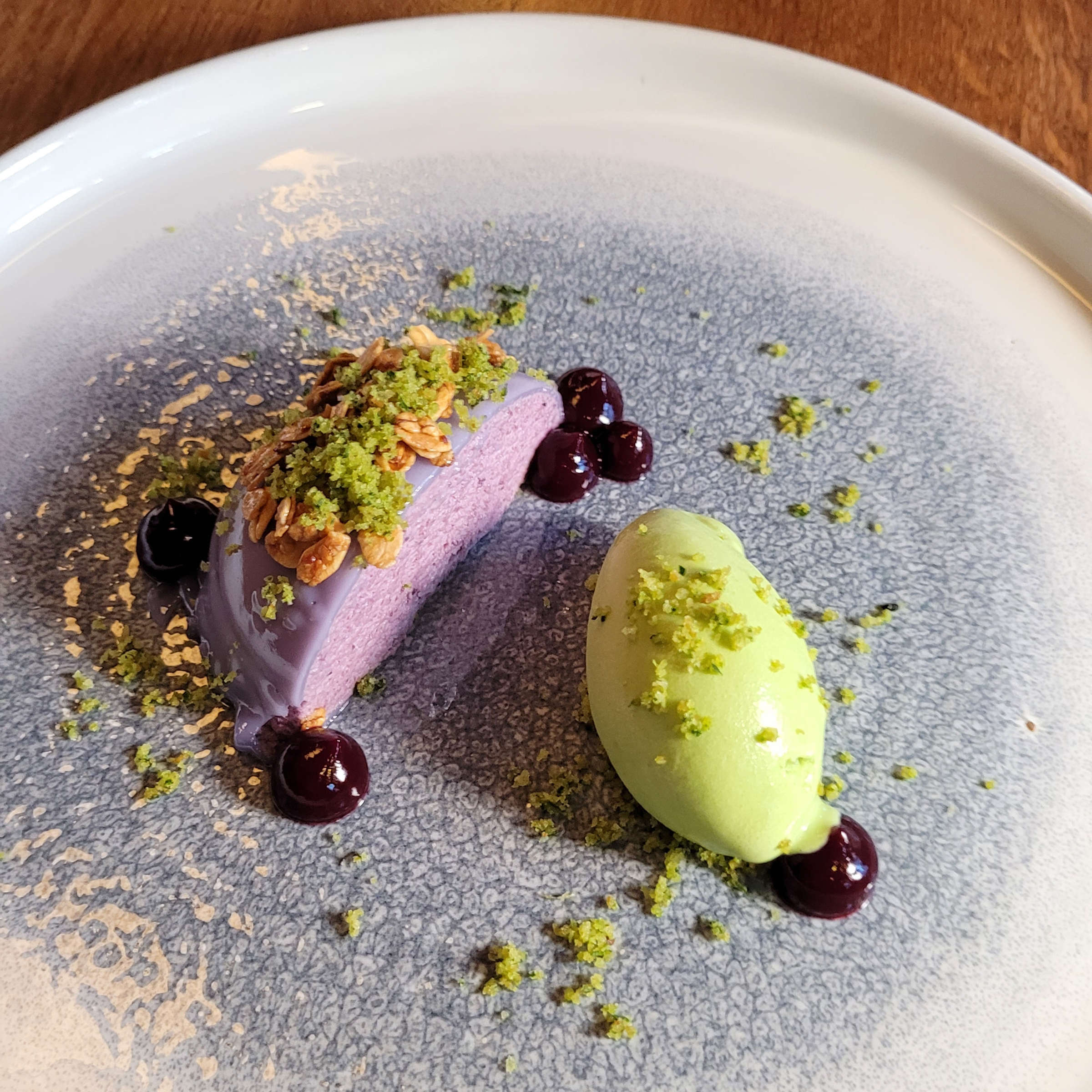 The dessert rounds off the menu wonderfully, both visually and tastefully. On the one hand, an almond date cake whose bite complements the almond milk ice cream and rhubarb compote well. Opposite, much more colourful and fruity: a tartlet of wild blueberry with a crunch of smoked oatmeal and parsley ice cream.