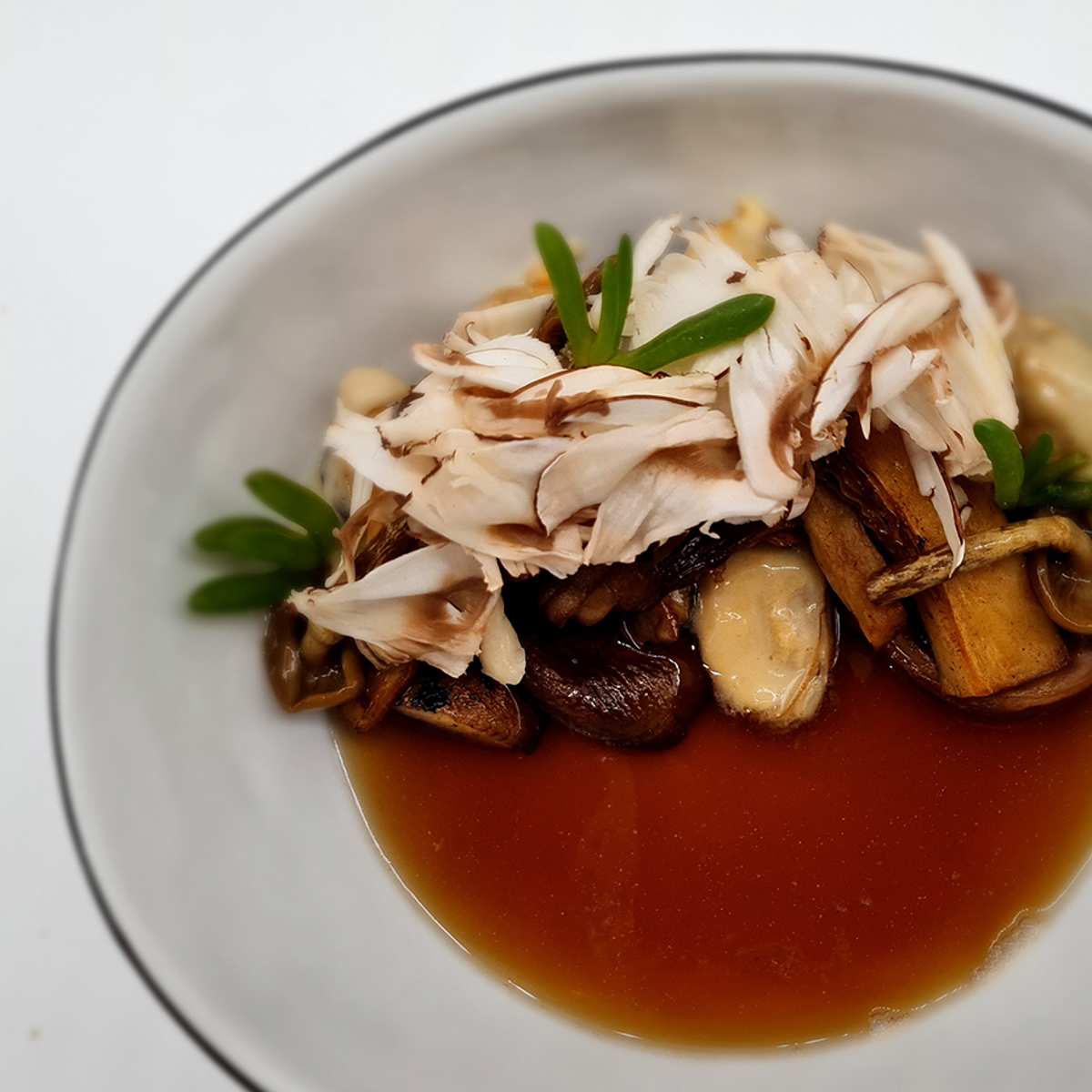 The menu continues deliciously with celery, egg and a lovely jus, followed by our highlight dish of the evening: a mushroom course with mussels and mustard seeds. The mushrooms are grown in the cellar itself and taste extremely intense. Thinly sliced, they form a small tower and are visually and tastefully impressive. They are accompanied by a 2020 La Bégou from Maxime Magnon.