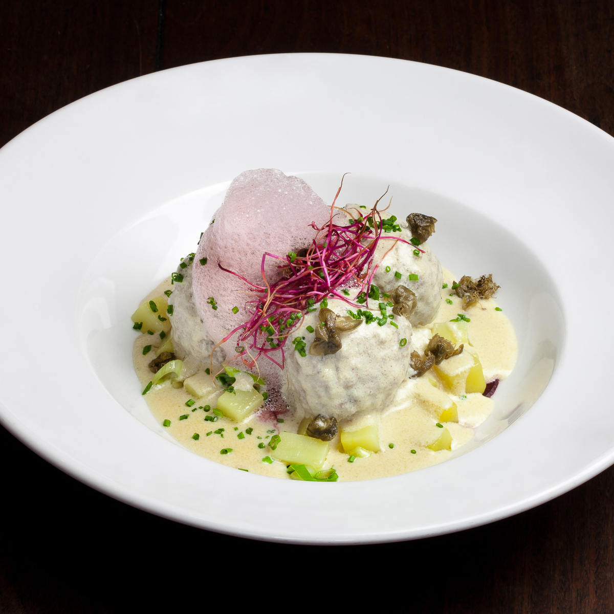 The portions are generous, without cluttering the plate. One of the house recommendations is the “Tokyo Style” pasta. Udon noodles with Iberico ham and a cooked egg yolk make for real soul food. Culinary childhood memories come to life through the modern interpretation of Königsberg meatballs with fried capers, diced potato, and beetroot foam.