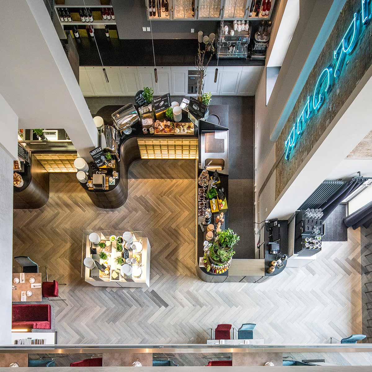 The restaurant Oderberger can be found in the former boiler room of a swimming pool, opened in 1902 and left in a Sleeping Beauty-like slumber before its refurbishment. Three levels and two galleries make up the enormous height. An urban interior that raises expectations.