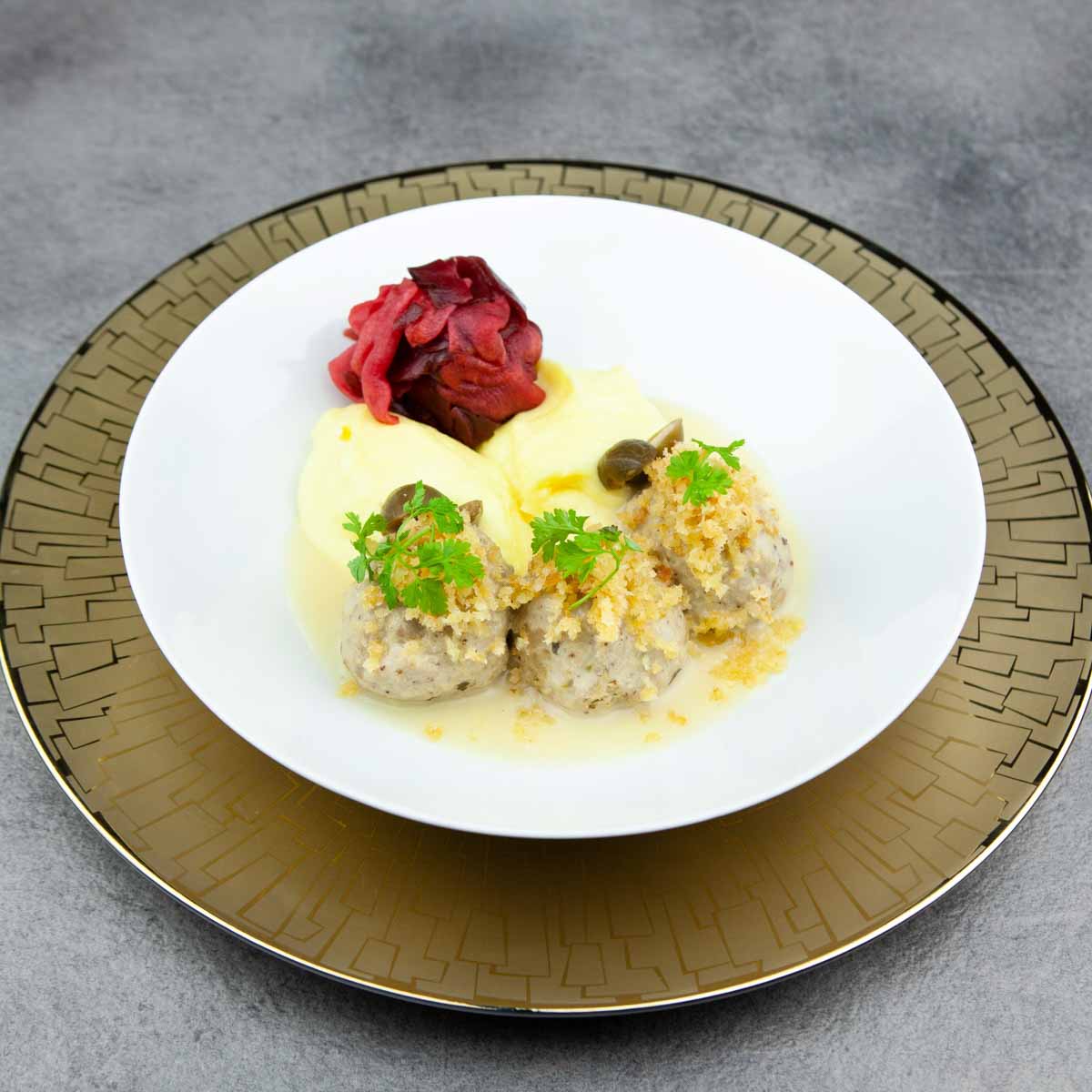The plaice rolls with Spreewald creamed sauerkraut, semolina dumplings, and bacon sound Berlin-like, but are actually seasonally-inspired. The veal balls Königsberger-style are typical of Berlin- with potato, apple, and beetroot salad, spring is in the air!