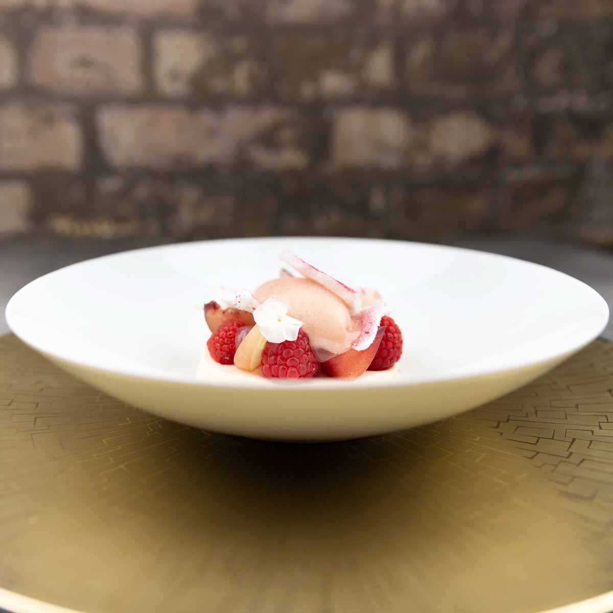 The brings the "Berlin Luft" to the plan. The interpretation of the foamy dessert cream classic is- with mint pesto, flambéed raspberries, and chocolate-multifaceted, just like the Oderberger itself.