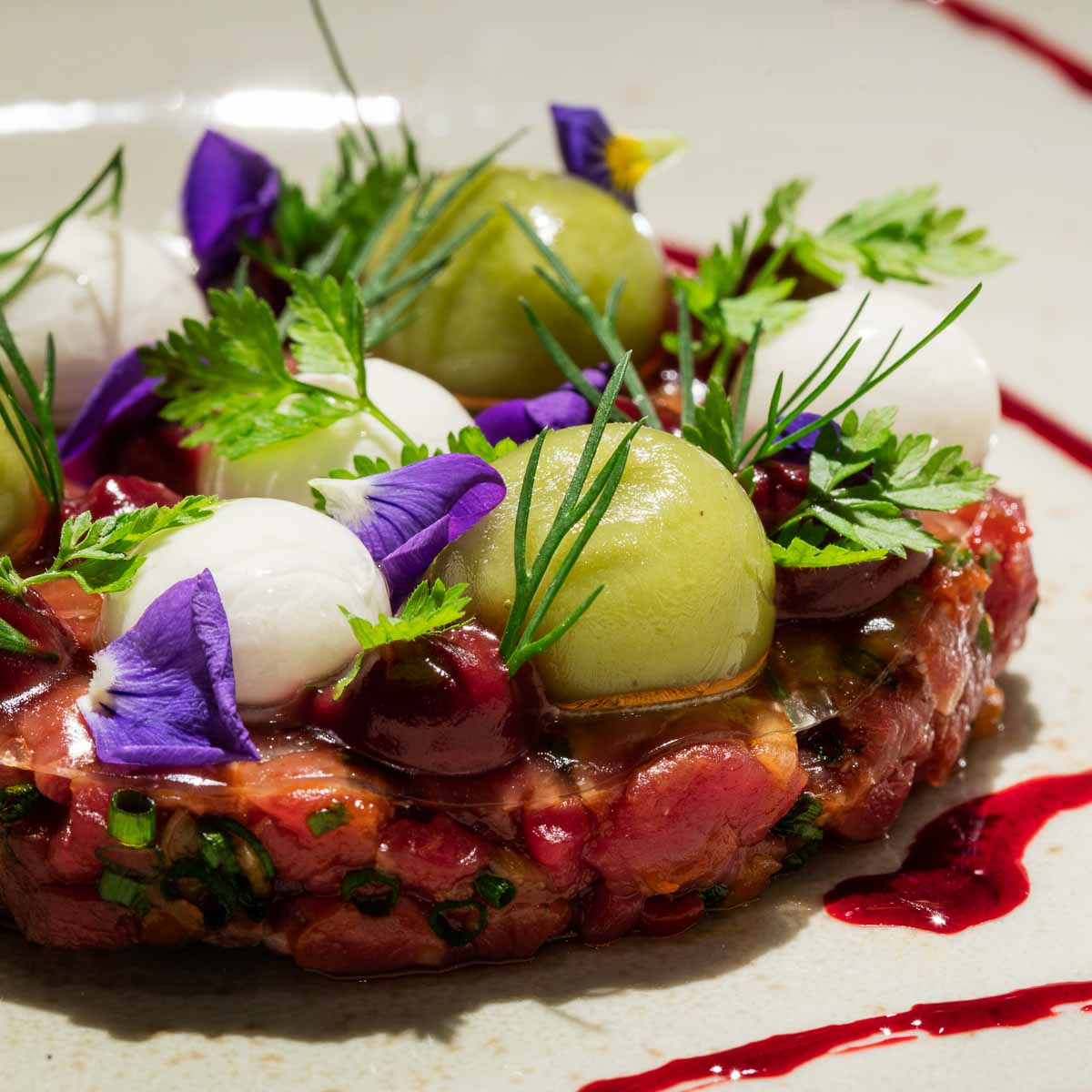 In between we enjoy the "Mackerel" with coriander prawn crackers and a heavenly mustard-mayonnaise, followed by "Beet Three Ways" doused in an aromatic mushroom stock, and the "Trout" on a fresh bed of cucumber with mâche, horseradish foam, and trout skin crisps. The "Salmon" from Färöer Island with avocado cream, mint, and herb stock is also incredible. It doesn’t get any more tender!