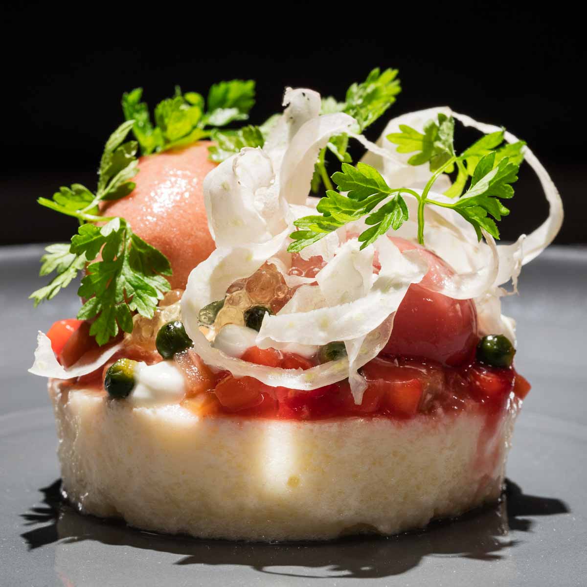 The sweet métier is also well respected here at Slate. The dessert of fine cream on a flat chocolate cake, swimming in a sea of passionfruit foam and Ferrari Spumante, is a wonder. The final blow of a brilliant menu — One of the most exciting openings of the year!