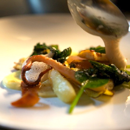 The amuse-bouche to set off our night is a soup of cauliflower with thistle oil. A creamy, yet light way to surprise us with the versatility of this vegetable. 'Warm beetroot, iced goat cheese, black radish and a cress salad' and 'baked mackerel, crunchy apple, cucumber and cilantro' follow. We were reminded of a situation at Filetstück - even though we're quite spoiled with food, we did not see the artistry of those dishes coming.