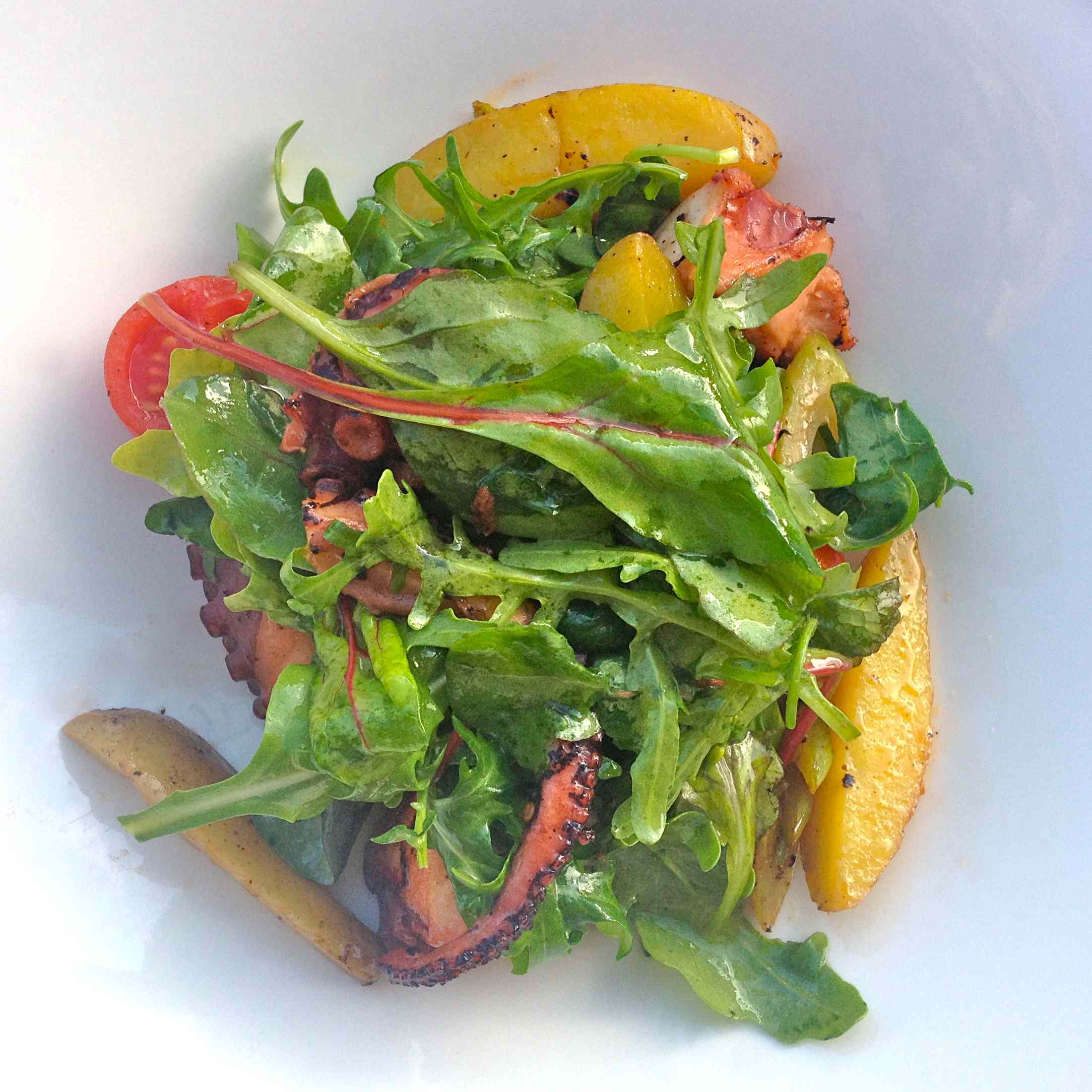Shortly after, the tomato course arrived: a carpaccio of beef tomato, a cherry tomato tarte and a tomato sorbet. I got grilled octopus and potatoes with saffron on a green salad with celery and tomato. While I was sceptical at first, I devoured it with the biggest pleasure imaginable.