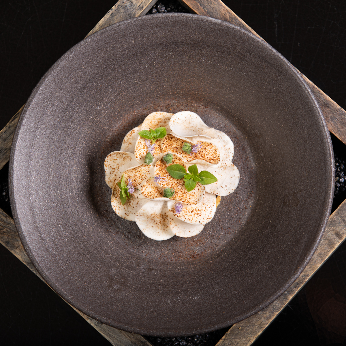 Delicate slices of dried vegetables with dabs of cream greet us. The joy continues with bread and fennel butter – both so good, we have to force ourselves to stop before it's too late. The next bit comes in form of a cream and foam of yellow beets and trout, followed by the finale of the pre-courses: a creation of avocado, black bean and a dust of black-pudding.