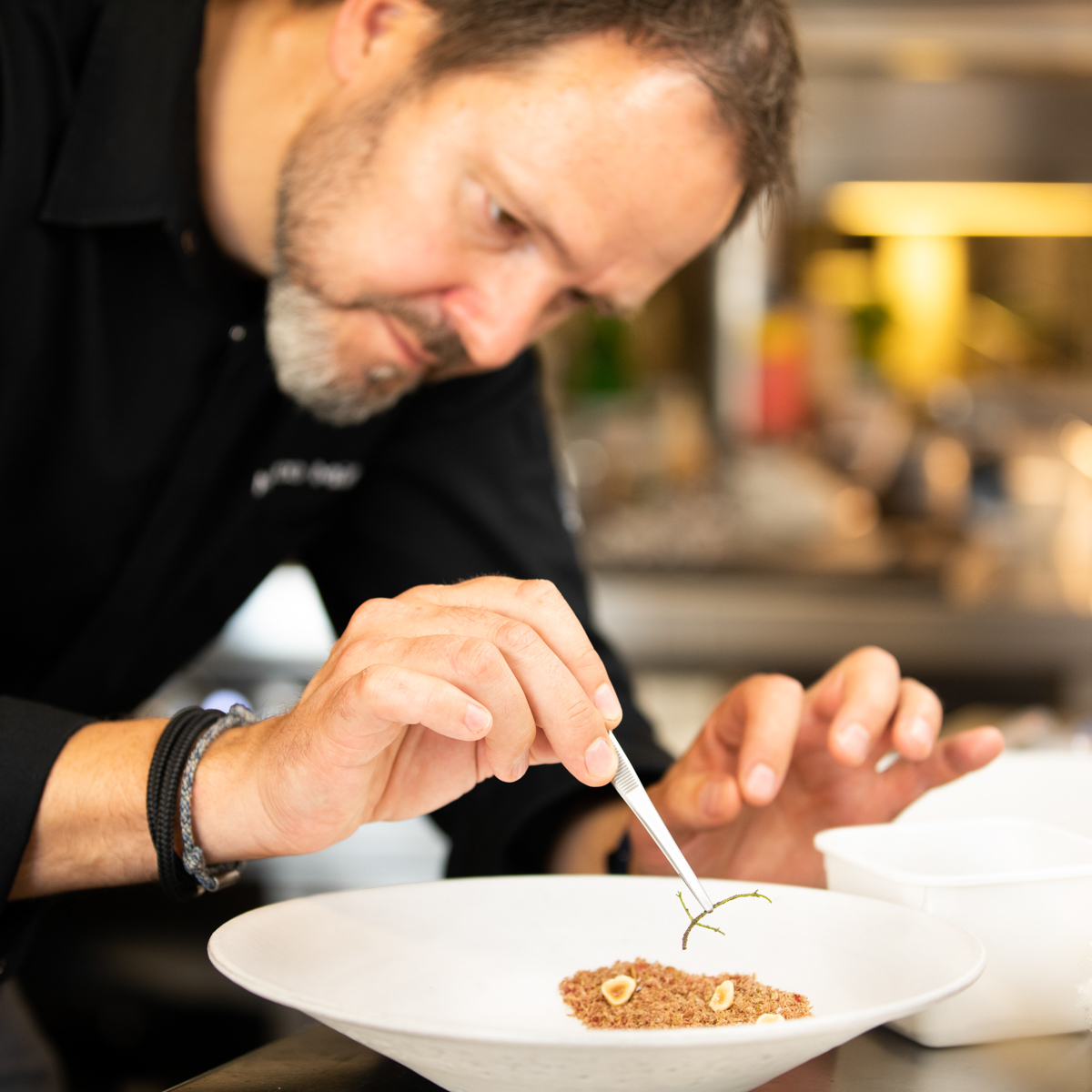 Geyler has a few words to say about each wine. But they're never too many and never intrusive, always a bit poetic and ever so avid about what he serves. Be it the aperitif, that is a 'Raumland' Winzersekt sparkling wine, or the apple brandy served at the end. A sommelier with all his heart and soul! Last year, Rutz was responsible for the 'Wine Menu of the Year'.