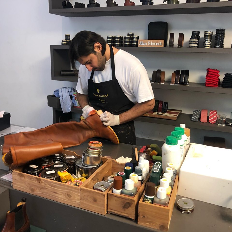 At Schuh Konzept, shoes are still being repaired with the right amount of dedication and the highest level of attention and craftsmanship. There's a special dress shoe service exclusively laid out for welt-sewn shoes, that uses only a special kind of sole leather. Shoes get repaired and refreshed in a very gentle treatment.