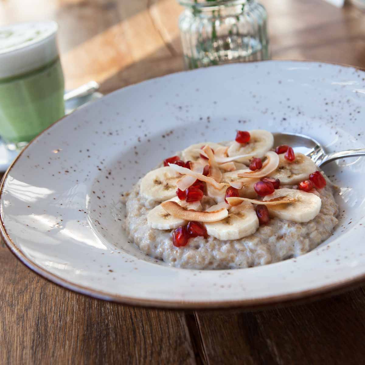 The pancakes are, of course, also available in a sweet version, alongside other excellently prepared sweet classics such as porridge, French toast - very delicious served with croissant pain perdu, blueberry compote and thyme Chantilly cream - or granola with grapes, poached plum, yoghurt, honey and fruit sorbet.