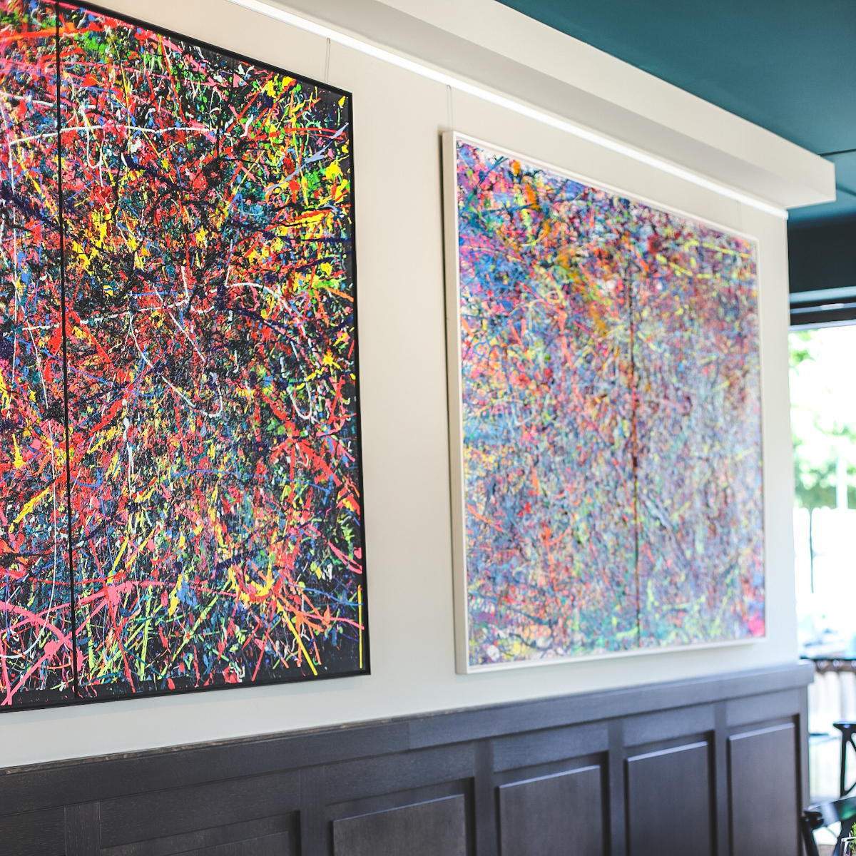 Velvet benches and dark wood create a stylish and cosy atmosphere. Jana Strohbücker, the founder of her own label, is responsible for the chic interior and has a good hand in art. The impressive paintings that catch our eye come from the German expressionist Mavadí and the Berlin artist Sophie Mangelsen.