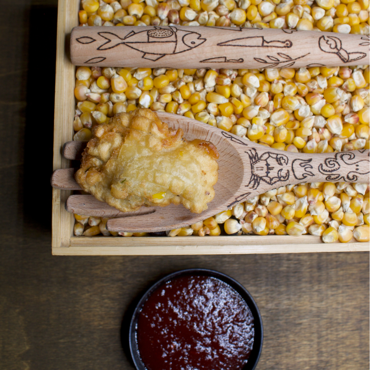 Super-crispy buñuelos are served in a stone pot that hints at the distant Andes. The deep-fried corn balls combined with a rather spicy rocoto jam unite home and faraway places as only deep-fried carbohydrates can do. To dig in.