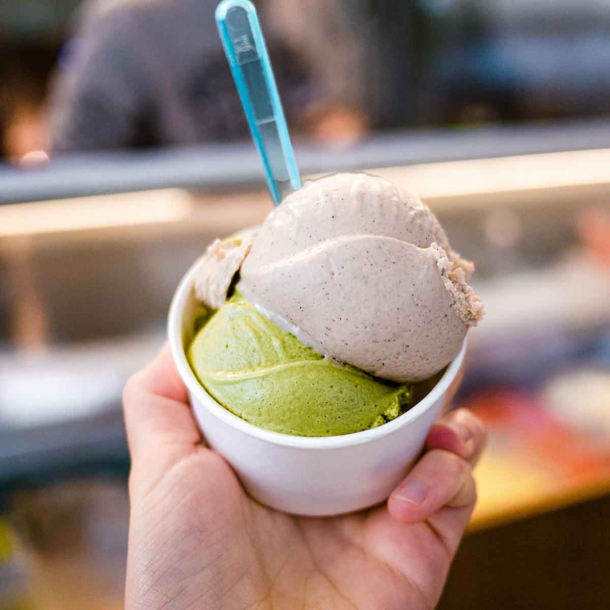 We try our way through the menu: chocolate fudge brownie, pistachio, strawberry sorbet and more unusual varieties like pumpkin seed, banana cinnamon, coconut-mango sticky rice or even curry. Nikolai has a free hand with the designs, drawing inspiration from various places, like eating a pumpkin seed pretzel or dessert experiences in Thailand.