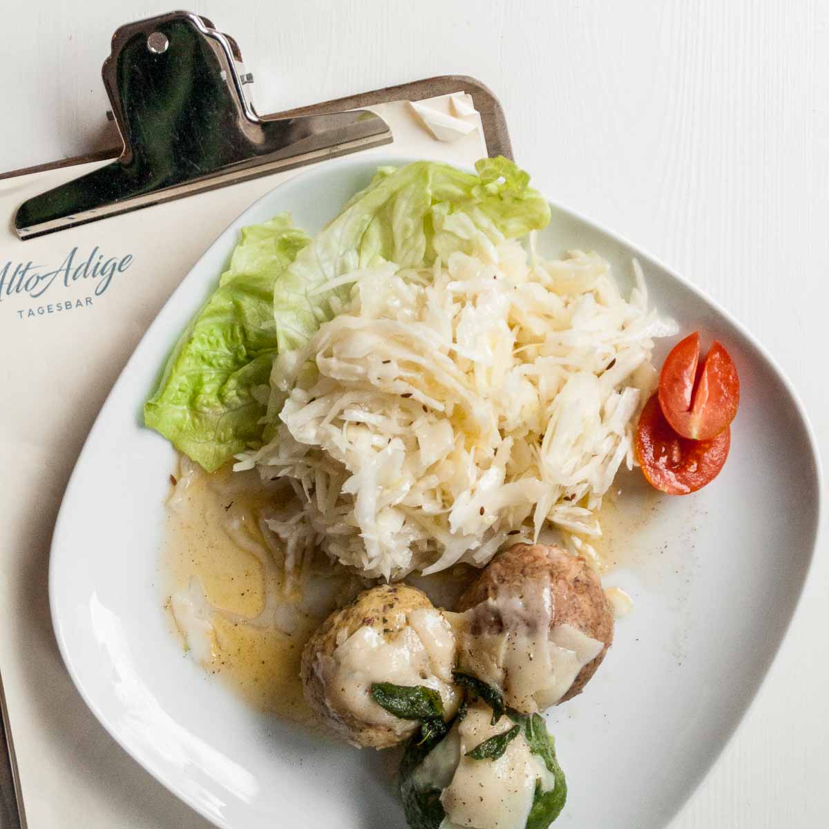 Upon closer examination, AltoAdige is even more specialized: food from South Tyrol should accompany wine from South Tyrol. Such as with Marende, an afternoon snack with cheese, especially from gourmet cheesemonger Capriz, smoked sausages, horseradish, and flat bread. You can also order cheese and "wurscht" for breakfast.