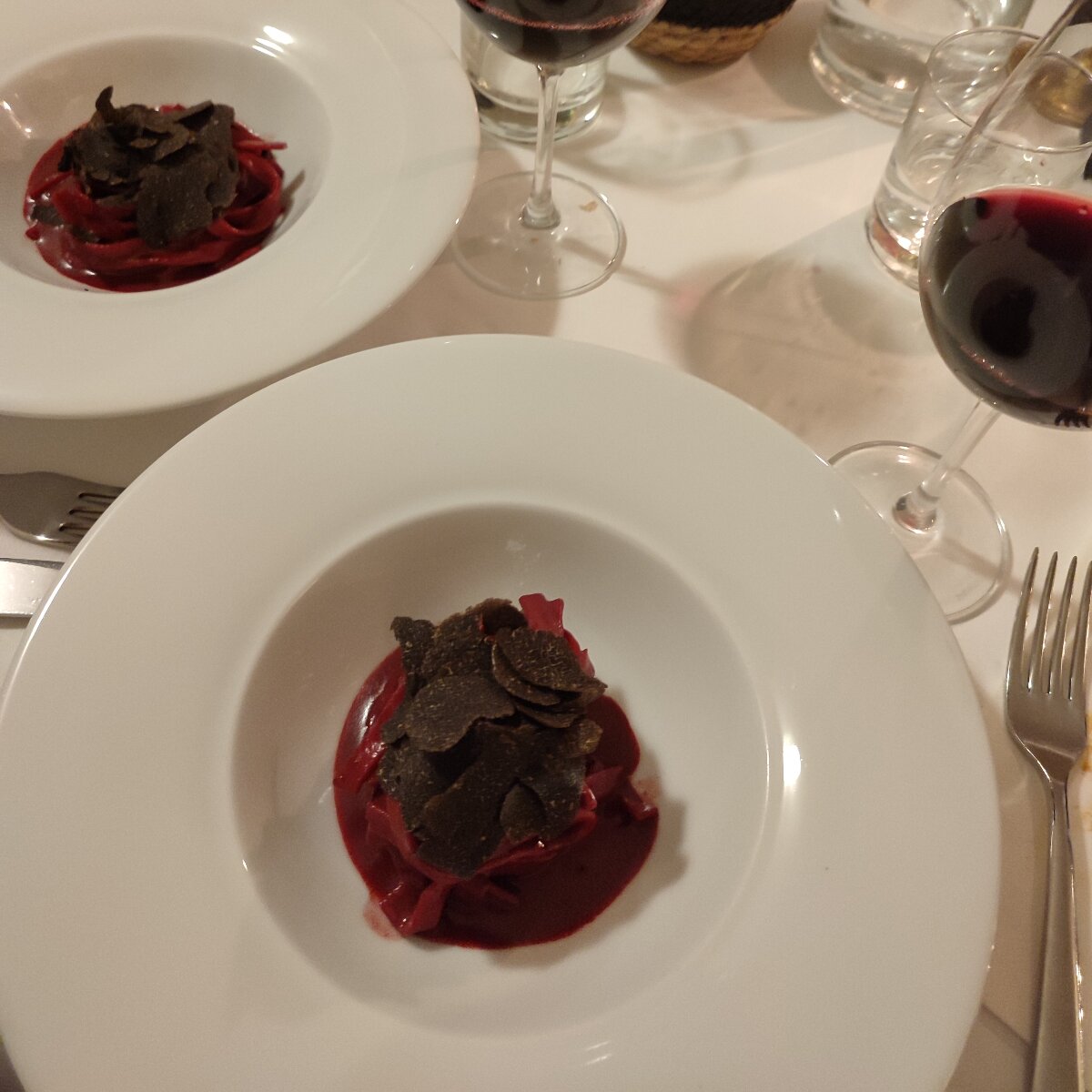 And so we also enjoy a pasta course that finally sends us into raptures: delicious beetroot tagliatelle with parmesan, miso and truffles. Not only is the deep purple of the pasta visually striking, but it also tastes wonderfully earthy; the pasta is obviously handmade and wonderfully al dente (not that we expected anything else). The warm truffle flavour perfectly complements the subtle acidity of the beetroot. All in all, an excellent dish with a modern interpretation, which we naturally wish for - and get - a red wine to go with it. After a bit of wine tasting at the table we choose a Poggio al Lupo from Tuscany.