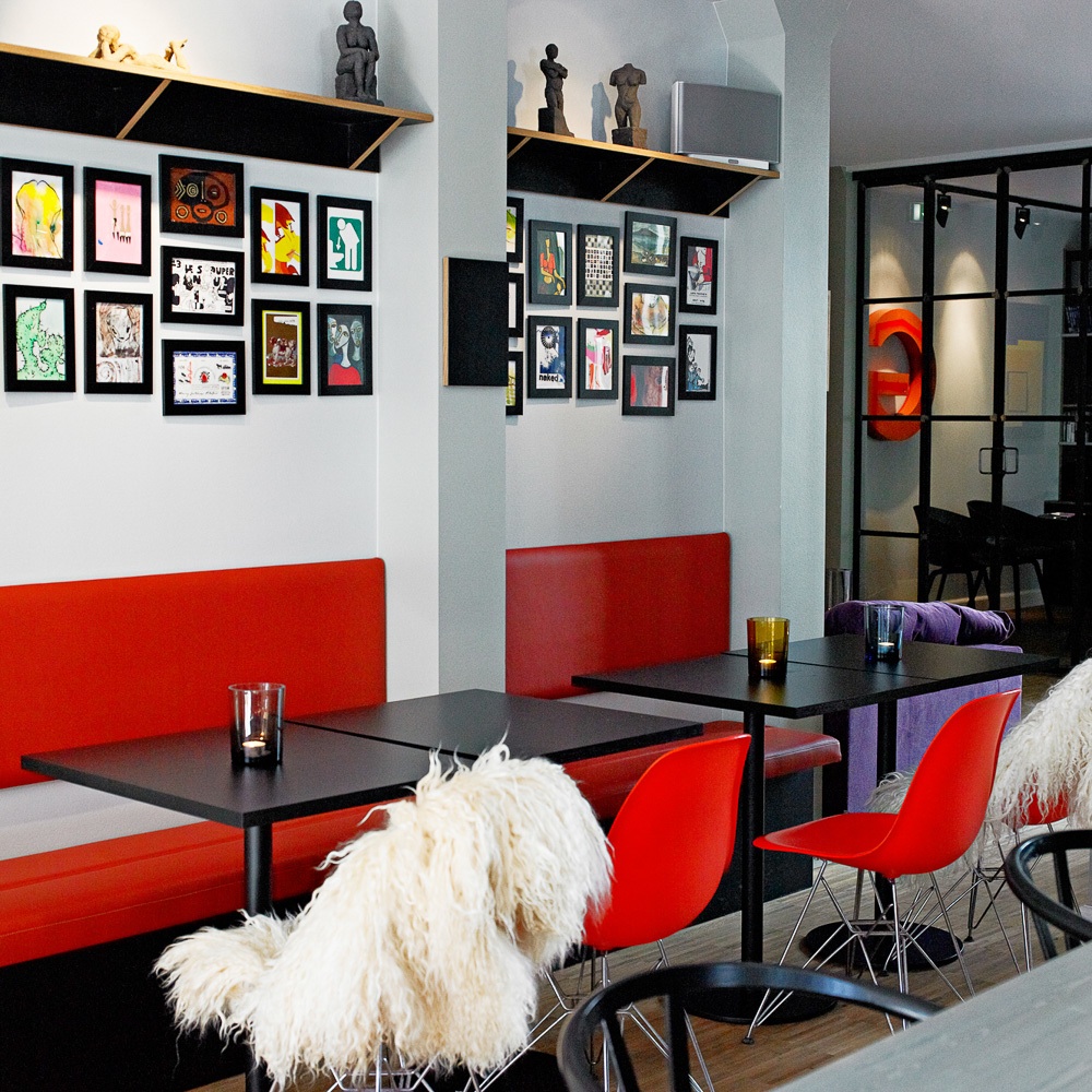 The breakfast hall is also the 'living room' and the nightly tapas bar. The pictured mounted on every wall are part of the new Artmoney concept and are up for sale. Artists can pay their stay at the Ibsens with art which will then be sold on-site for 200 crowns.