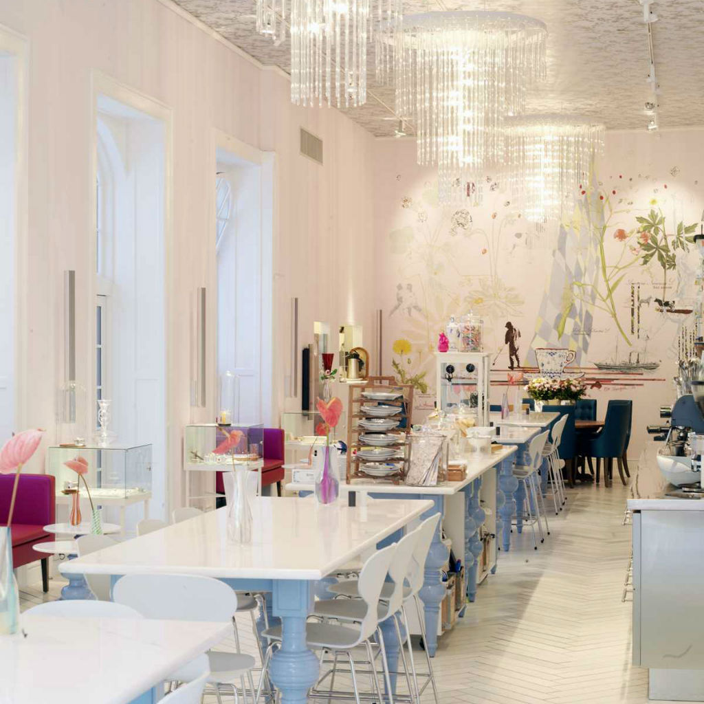 The café is hidden in an alley between the two flagship stores of ‘Gerorg Jensen’ and ‘Royal Copenhagen’. Outside the café you can enjoy your meal and hot drinks all year around – but the true beauty is inside the café. The room will blow you away and the walls are filled with beautiful art and shelves filled with cute decor, cookbooks and pieces you can shop. The café also sells their own cookbook if you would like to make your own smushi’s and impress your friends and family.