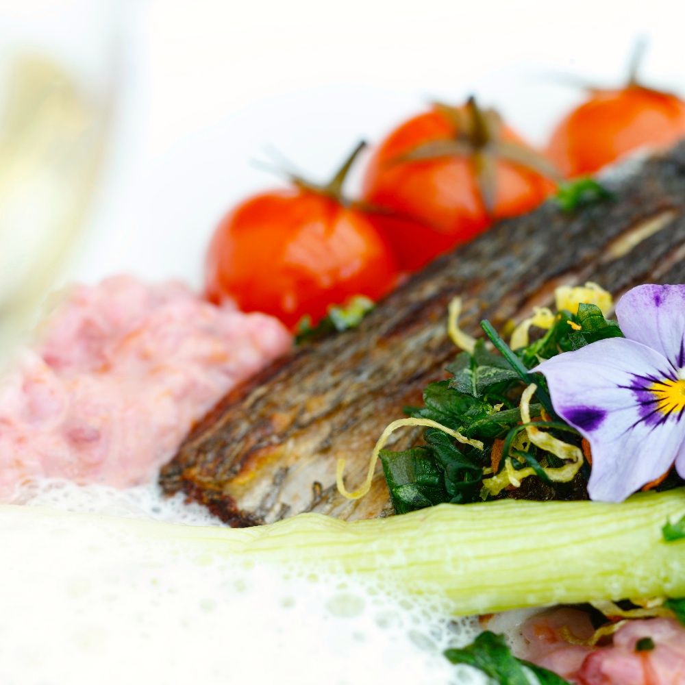 But back on topic, we were served four different appetizers on a big plate: goat cheese au gratin with lime mustard on a salad of asparagus, slices of delicate Bresaola, wild garlic soup with asparagus and tomato sorbet as a perfect match. The exquisite combination of hot and cold, the perfectly seasoned soup and the mild sorbet had us gushing instantly.