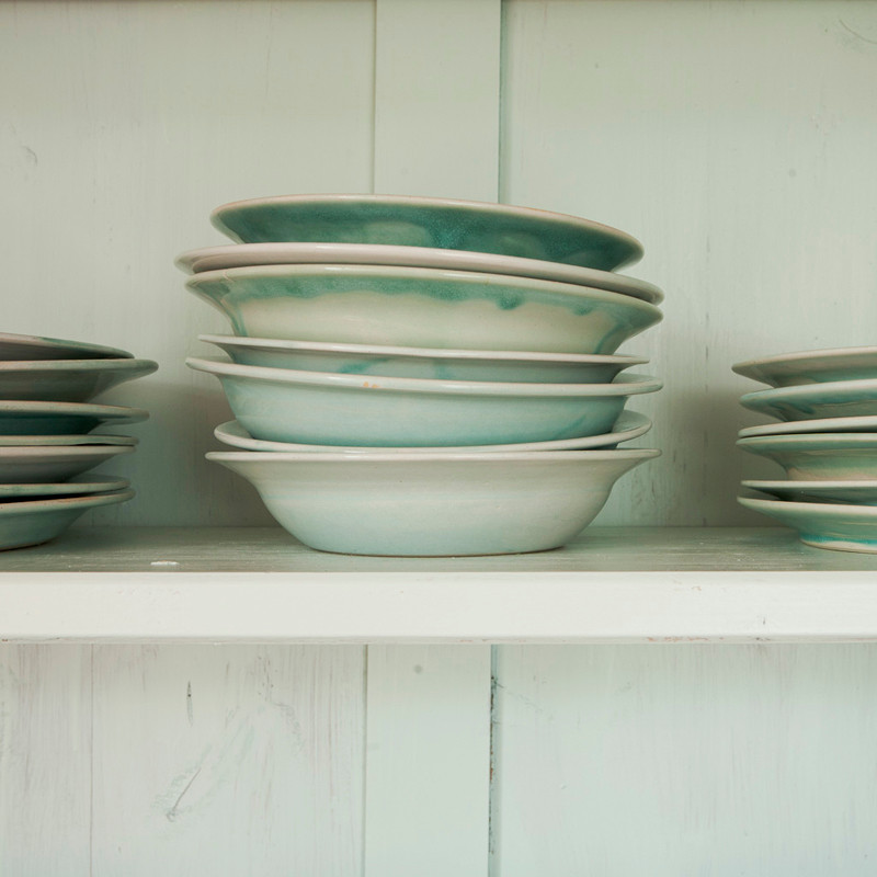 Ceramicist Melanie Follmer is a textile designer originally. Her love for workshops and her invendiveness however, have made her start all over again professionally in 2008. The passionate cook has always liked ceramics but felt that it was missing any kind of contemporaneity. So she decided to set her hands to it, got herself an old potter’s wheel and the result were simple, elegant plates, bowls and cups for daily use. The three dots in her brand’s name …F represent the three elements used for pottery: earth, water and fire; the F is her last name’s initial.