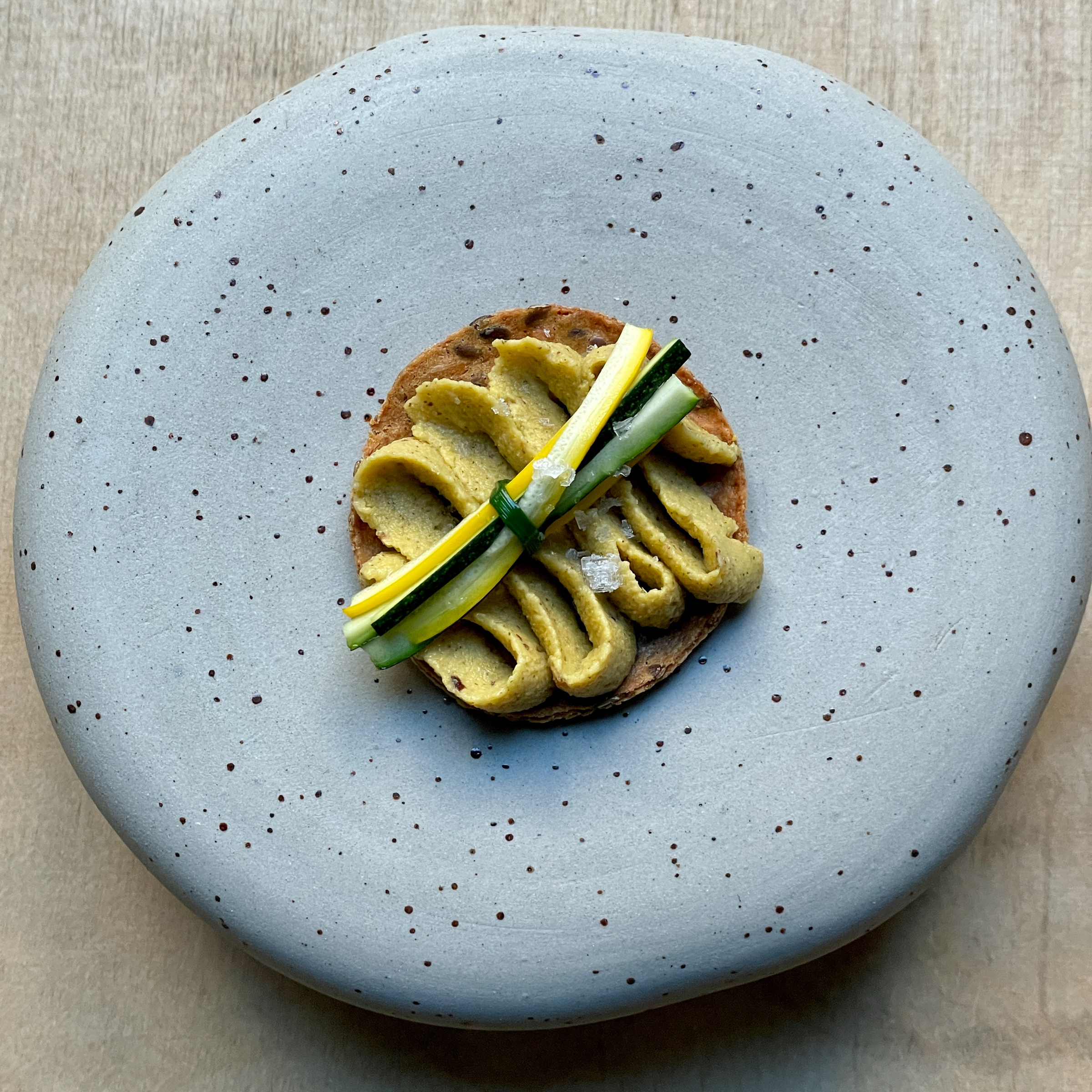 To table. We start the way with a cracker with zucchini cream and strips. Crisp and fresh. The first course is prawns from Neue Meere in Lower Saxony. They were flamed with hot coals, so they taste slightly smoky. The seafood is butter-soft and melts in your mouth. They are served with a sweet and spicy malt vinaigrette.