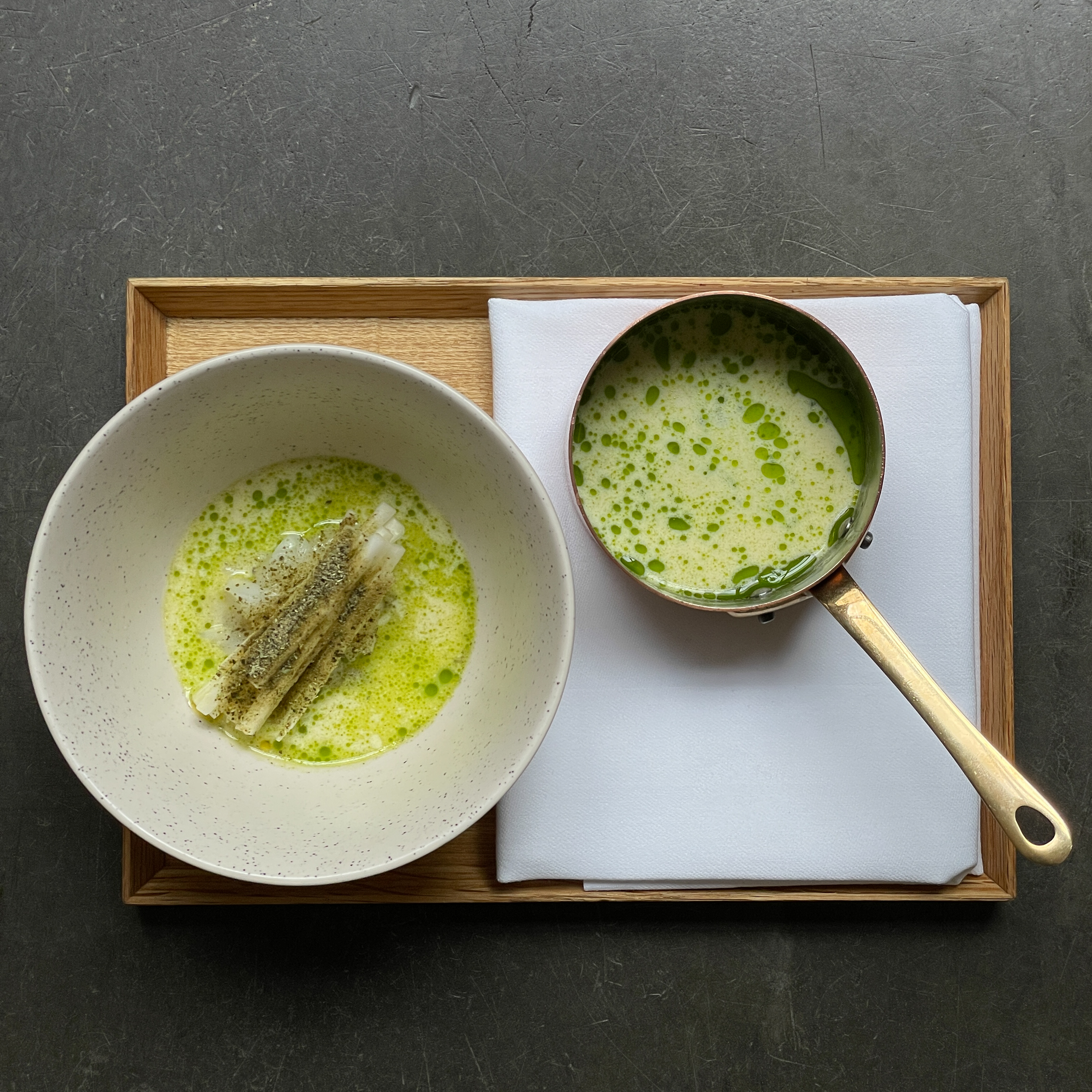 The third course pays homage to asparagus: chicken-asparagus dashi, served with raw, marinated asparagus and asparagus velouté with wild garlic oil. Asparagus can taste like this - with an Asian touch and without heavy sauces. Accompanied by a glass of modern elaborate wine from southern Burgundy. Chardonnay grapes that have matured in steel tanks. The result is a fresh, modern Chardonnay with the creamy, juicy notes of the grapes.