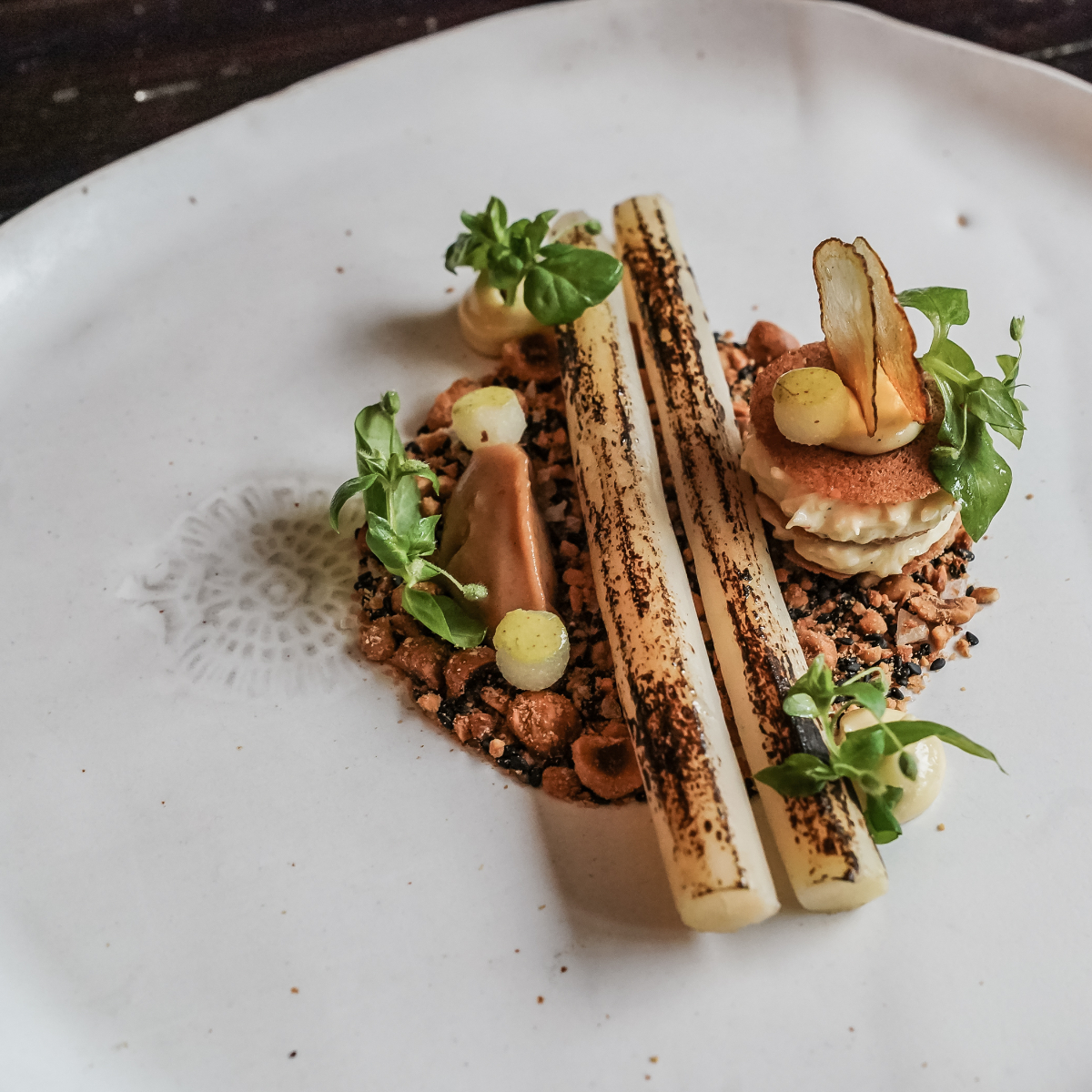 We have hardly emptied our wine glasses when the cool Silvaner from the Brennfleck winery in Franconia is ready. "Fish must swim," the waiter explains with a wink. The Müritz char comes accompanied by green and white asparagus and a nut butter emulsion. Delicious!