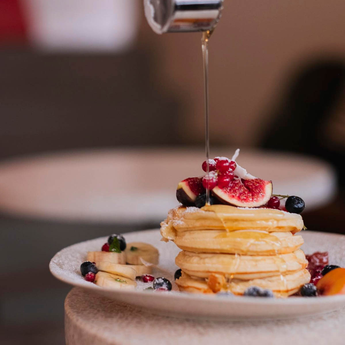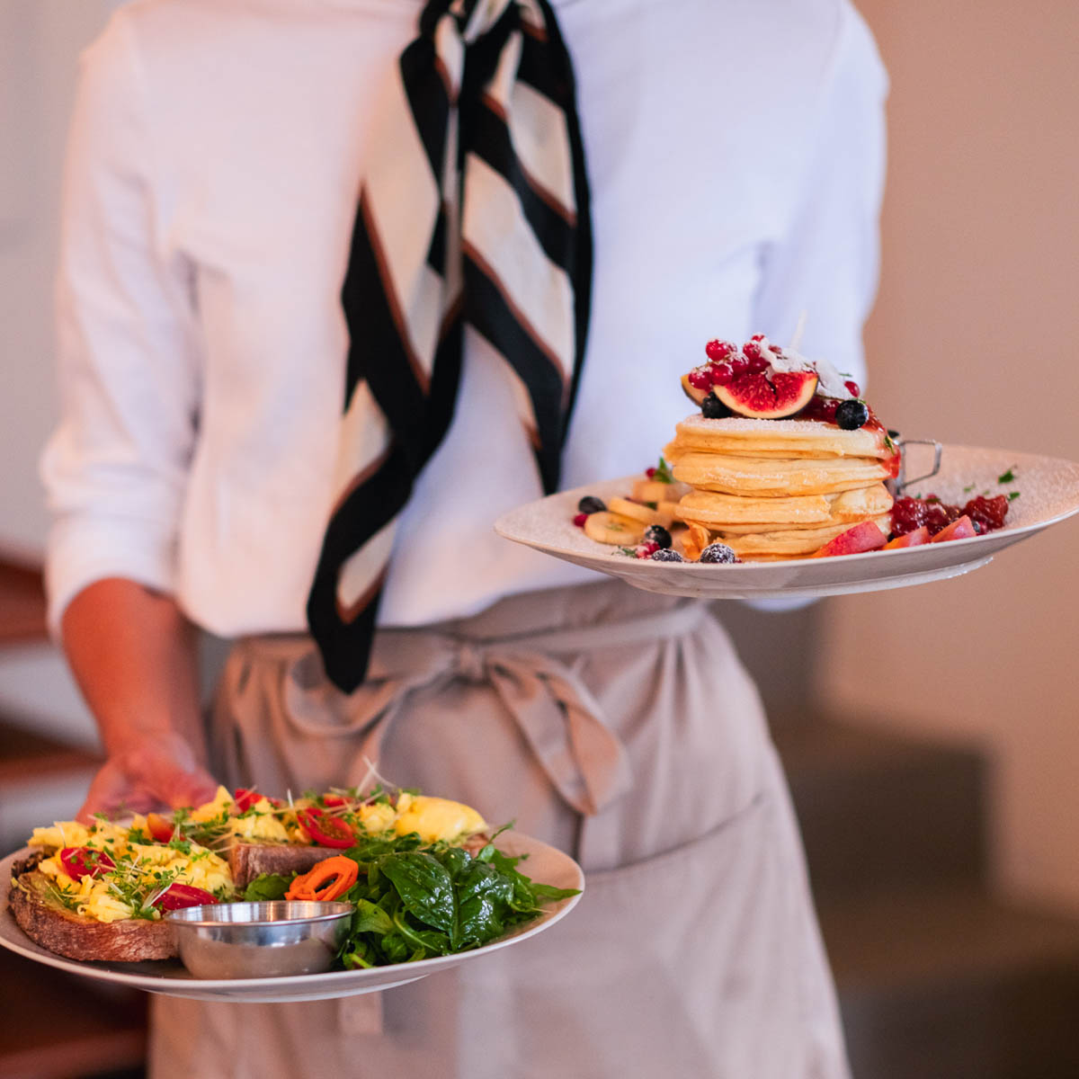 And who says a breakfast doesn't need dessert? That's why we try the fluffy pancakes with mascarpone and maple syrup or a slice of cake from the display case, whose creamy frosting particularly appeals to us. Of course, a flat white goes wonderfully with it.