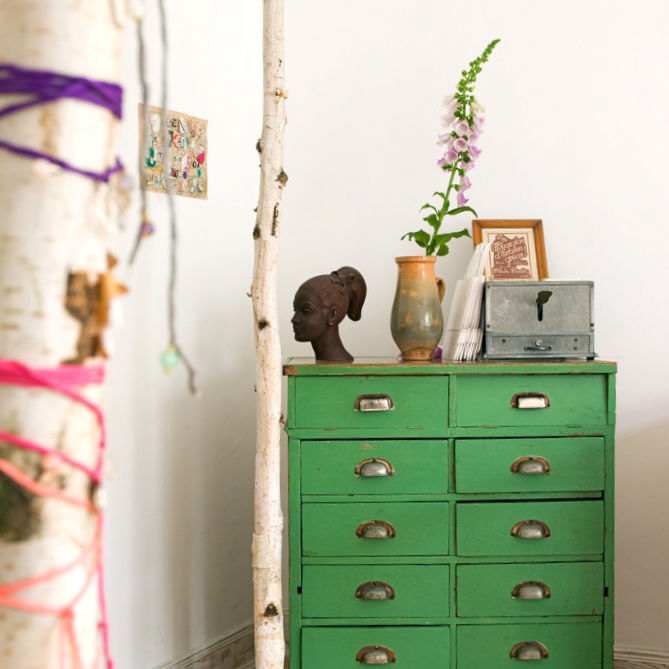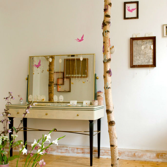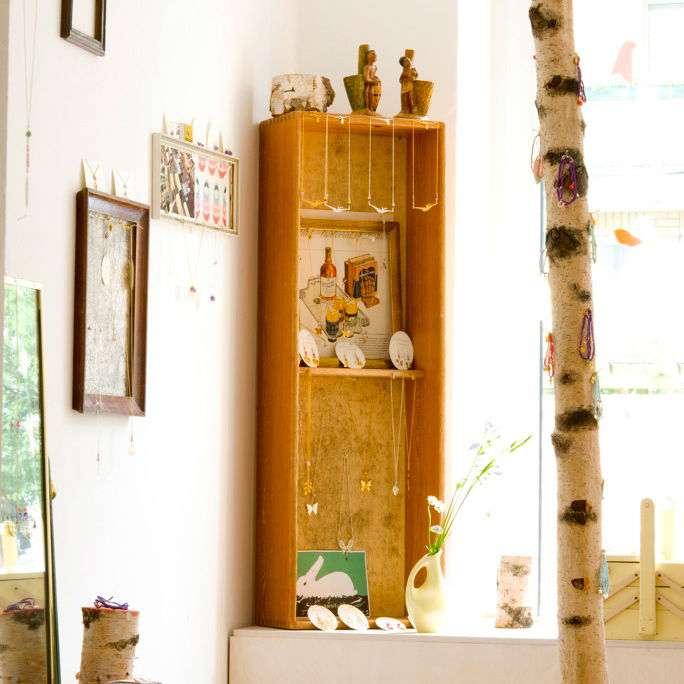 I am happy to announce that I stumbled upon an actual fairy forest! It’s located right on Juliusstraße 13 in the very heart of Hamburg’s Schanzenviertel. It was a grey rainy day when I first entered the little jewellery shop but the sun rose again for me when I saw the birch trunks that adorn the inside of this magical place. Jewellery everywhere, delicate necklaces, earrings and bracelets hung up on the white bark, staged on old frames, mirrors and vintage furniture - it’s a fairytale scenery! Stars, hearts, tender leafs and dragonflies huddle against sparkly gemstones.