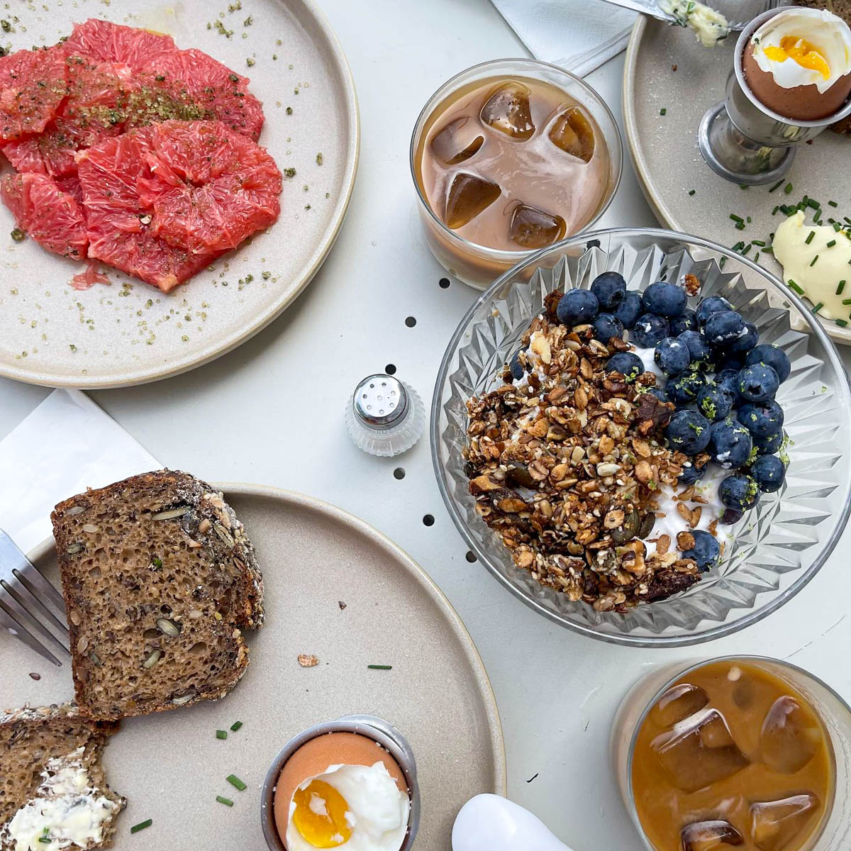 From the white-tiled coffee bar as the centrepiece, Kiosque also offers various meticulously crafted coffee specialities and excellent matcha. Colourful tomatoes on Danish rye bread or French toast, also known as "arme Ritter," made from buttery Shokupan and topped with seasonally changing toppings, taste excellent for breakfast or brunch.