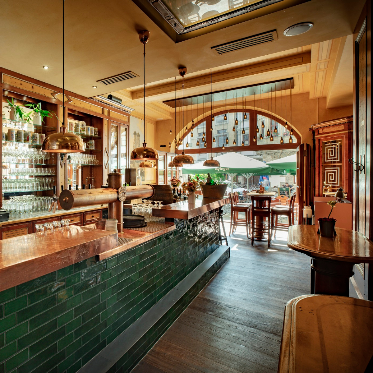 Wood-paneled walls in the interior along with chic metal elements, cozy seating niches and rustic antlers create a stylish Bavarian flair. A real eye-catcher is the new bar counter, which will be put into operation in mid-2021. Noble copper meets fir-green tiles here.