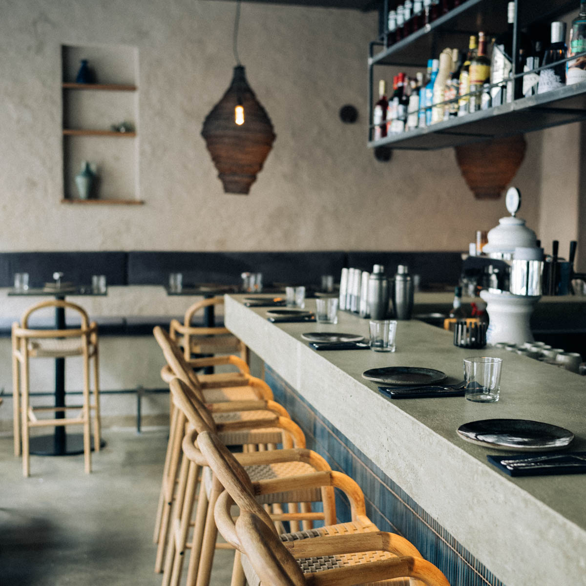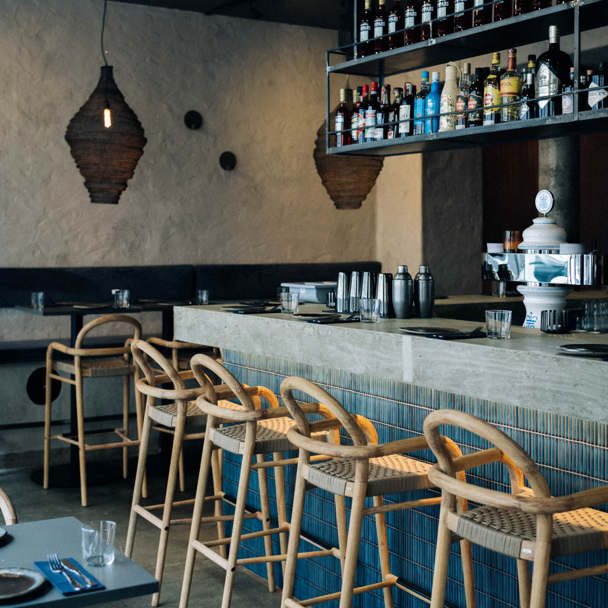 The matching ambience for the excellent Mediterranean cuisine consists of blue, shiny tiles, large bast lamps, shapely wooden chairs, rough concrete walls and chic ceramic accessories. Add to that candlelight, lounge music and DJ performances on weekends - Orient meets Ibiza, if you will.