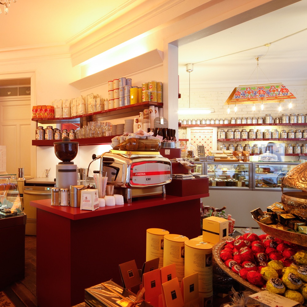 The story continues with the café that is set in the second room: you pick and choose to combine your own box of chocolates from a vast selection of pralines, have a coffee or tea, fresh juice or "raw chocolate drinks", the new superfood, while roaming the beautiful cookbooks available. The "Götterspeise" coffee and espresso house blend is roasted by a little country roaster nearby – you can taste that quality!