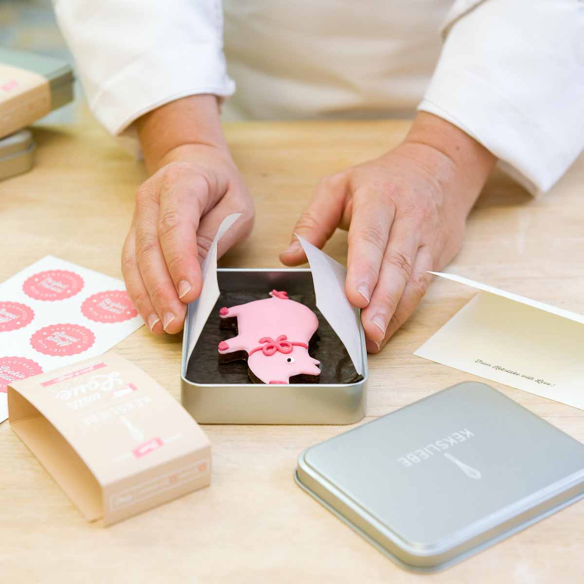 Creativity knows no boundaries at Keksliebe. From classic seasonal cookies likes snowflakes, flowers and Christmas trees, to football T-shirts and dirndls, its even possible for Keksliebe to personalise cookies with your own logo. For bespoke cookies you only need to order a minimum of 20 cookies. All cookies are beautifully wrapped and carefully packed and can be delivered anywhere in Europe.