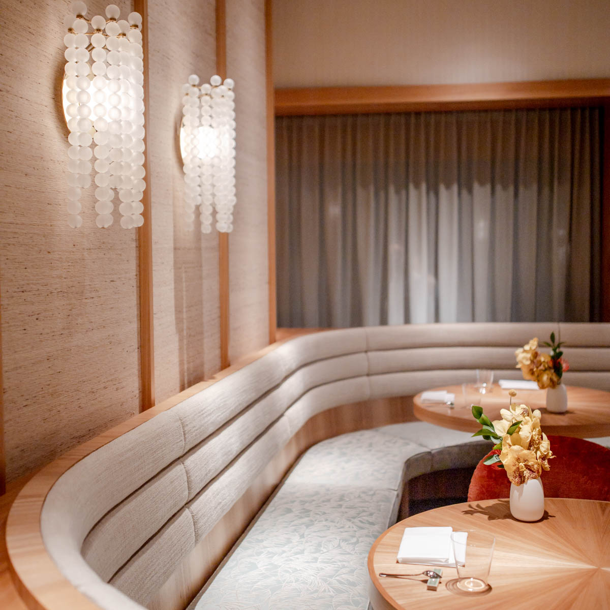 The elegant, light-coloured seating niches in the cosmopolitan fine dining restaurant are also positioned so guests can see into the open kitchen and watch the well-coordinated team preparing the food.