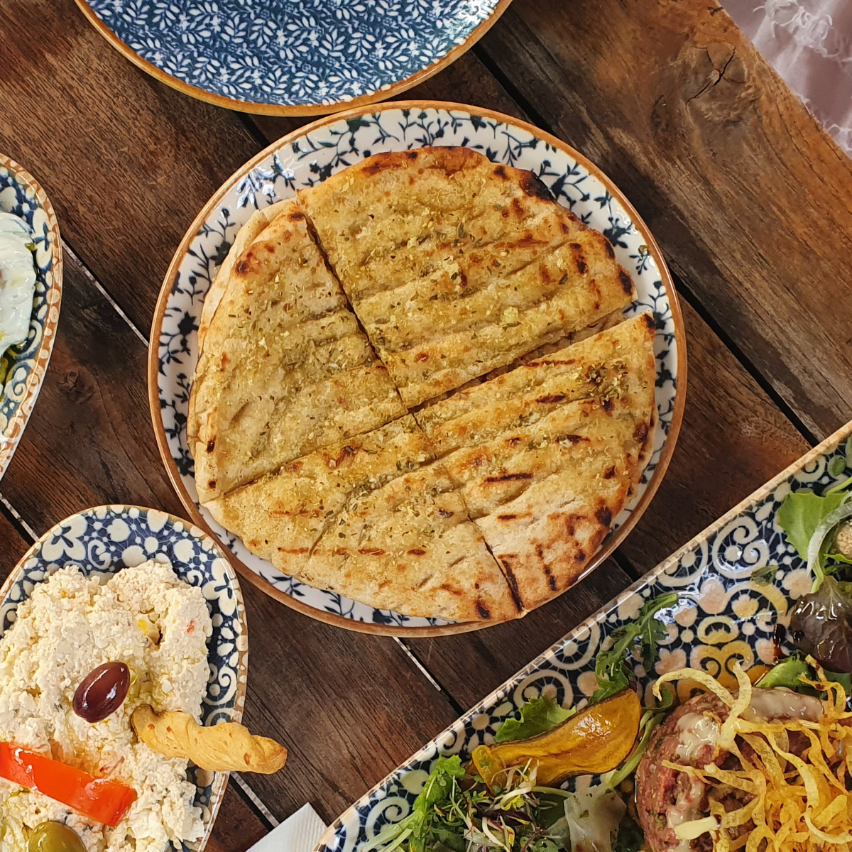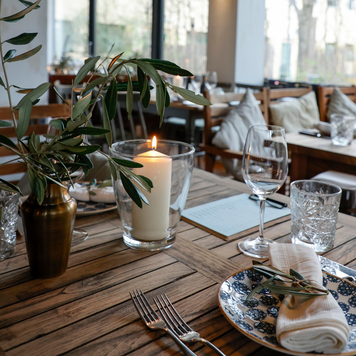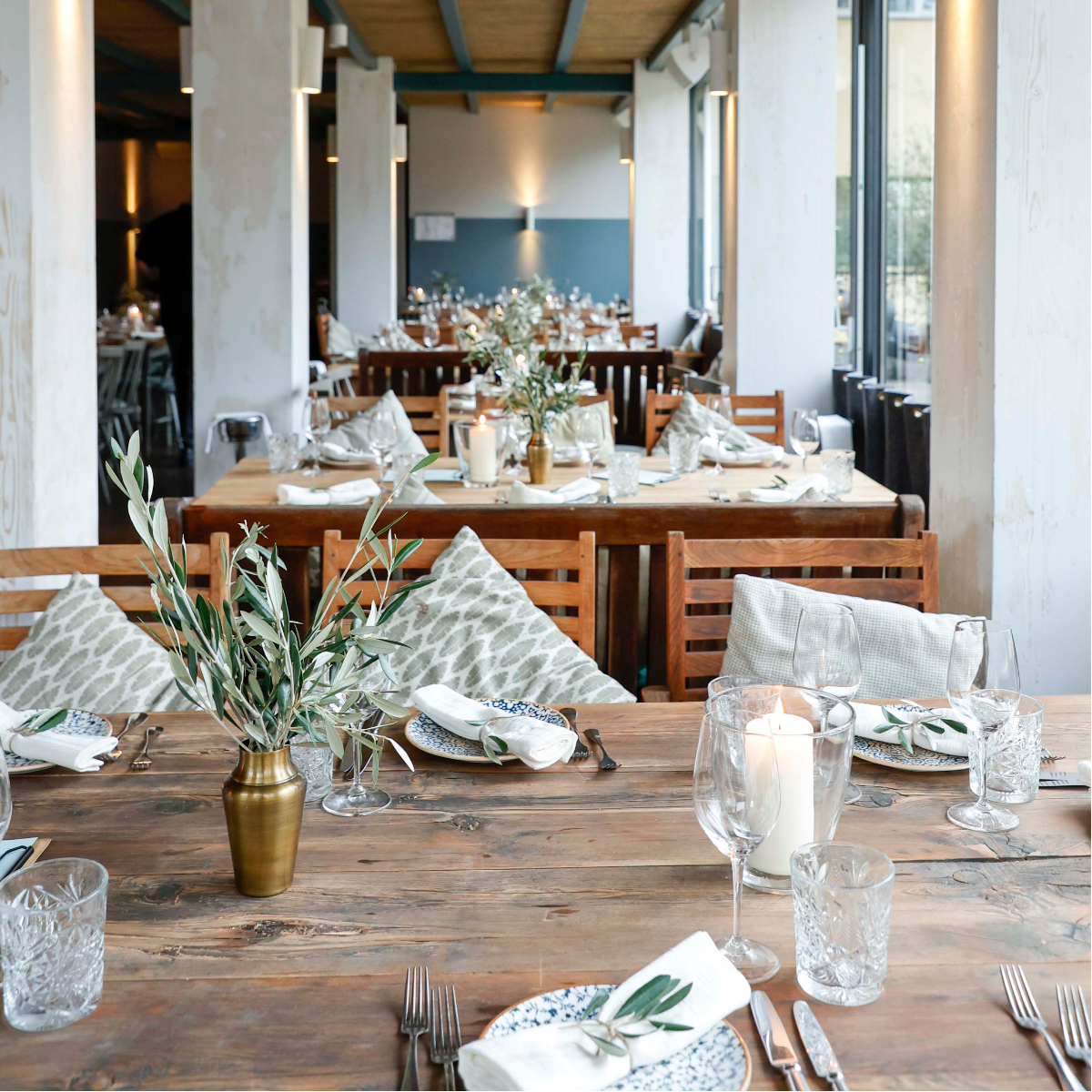 In keeping with the Mediterranean holiday feeling, when the weather is nice, you can bury your bare toes in the heaped-up sand in the outdoor area of Moro Mou. Inside, on the other hand, a modern ambience with lots of wood, olive branches as table decorations, muted tones and blue and white crockery creates a pleasant atmosphere.