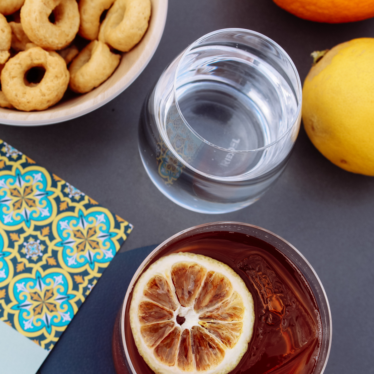 The city becomes a hidden object: over there, the waste incineration plant designed by Hundertwasser! Over there, on the other side of the Danube, the Uno City! And right next to us is the towering St. Stephen's Cathedral with its artistic roof. While we are still gazing fascinated into the distance, the attentive waiter brings our drinks: the signature drink Negroni Frizzante - a sparkling, light version of the classic - and a Ritz Spritz, for which the Select Aperitivo from Venice is used.