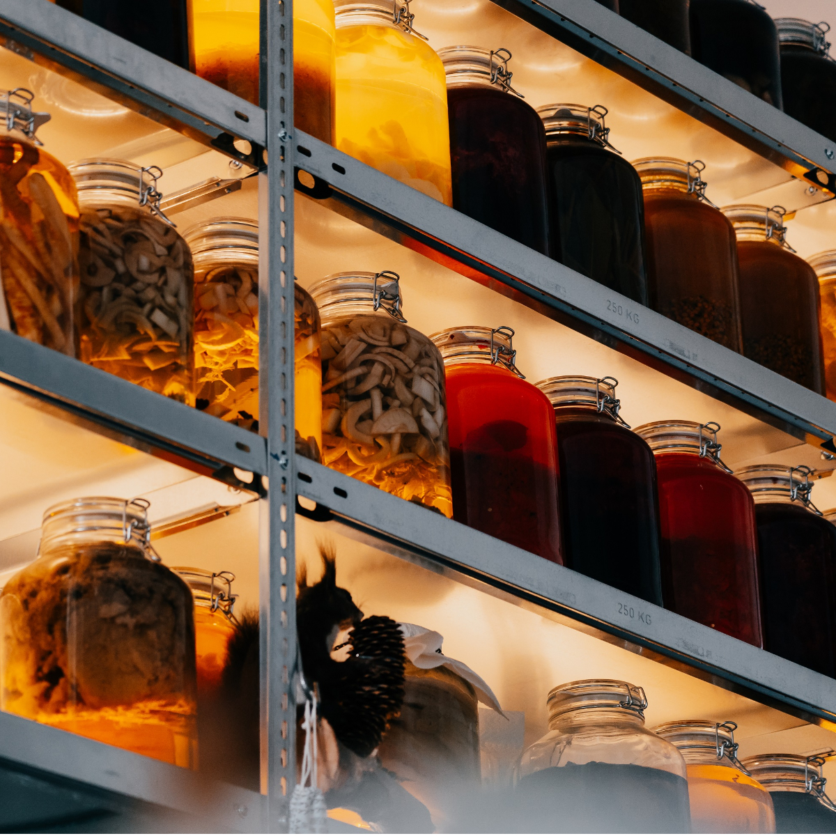 In addition to spirits, you will also find pickles and fermented products from Lucas Steindorfer's kitchen. The assortment changes according to season, desire, and mood and ranges from wild garlic kimchi to salt lemons and various chili sauces to rowan berries.