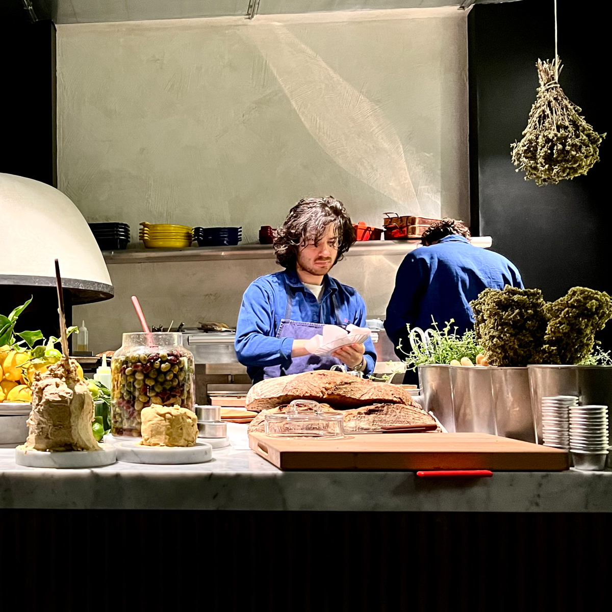 C.O.P. stands for "Collection of Produce" because, according to Elihay: The focus is on the products and the people who produce them. "We are simply curating the things we love," he says. Consequently, the counter covered with these favourite products forms the heart of the restaurant. The bar and anything else that might distract has been banished to the kitchen.